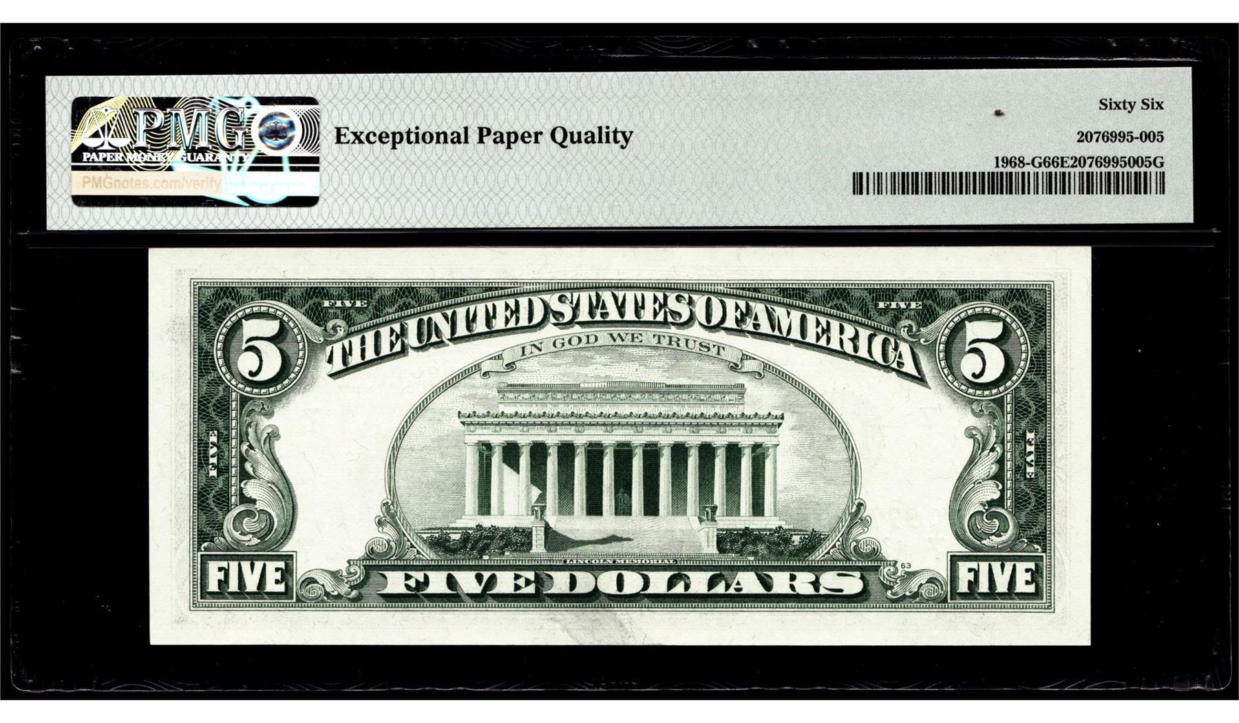 One 1963A $5 Federal Reserve Note Chicago Fr.1968-G PMG Gem Uncirculated 66EPQ. PMG Certified.