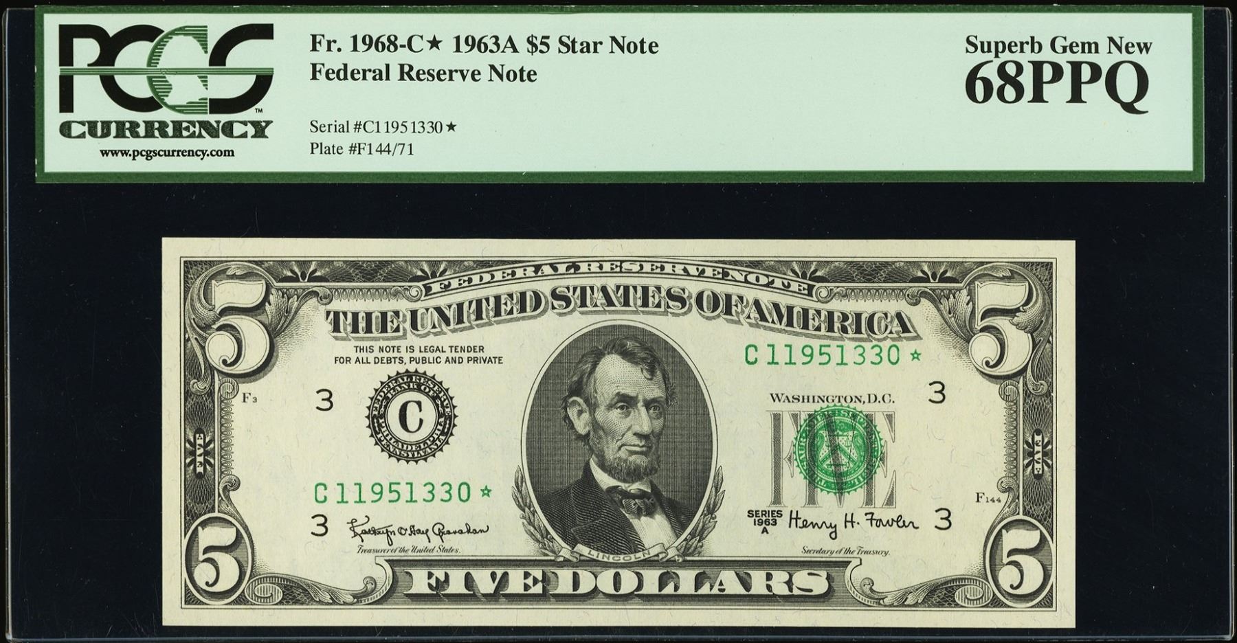 One 1963A $5 Philadelphia Federal Reserve STAR Note PCGS 68PPQ.