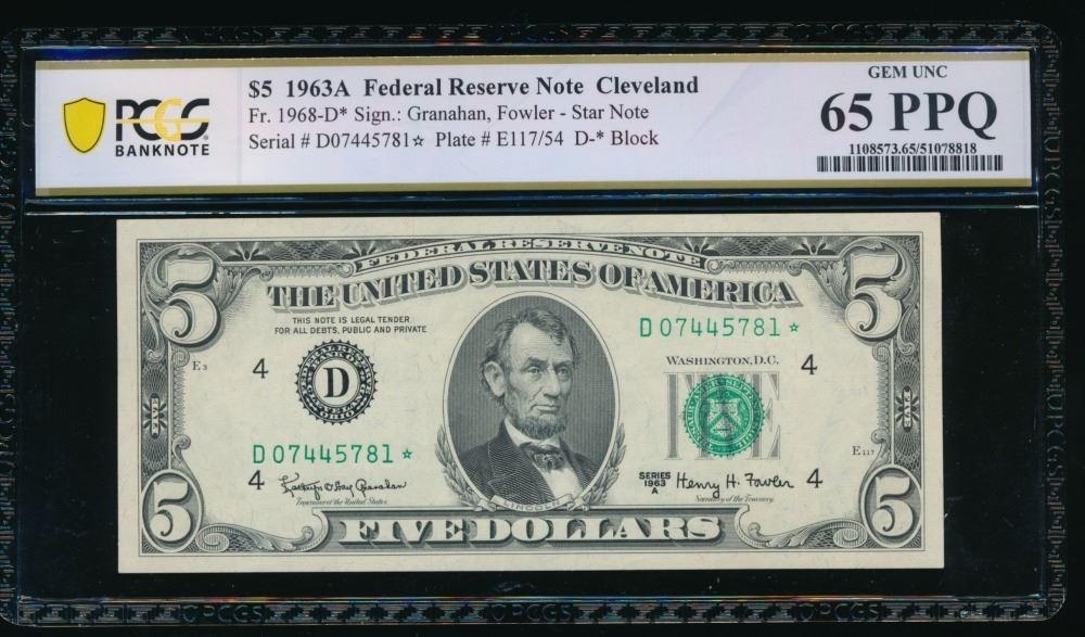 One 1963A $5 STAR Cleveland FRN PCGS 65PPQ.
