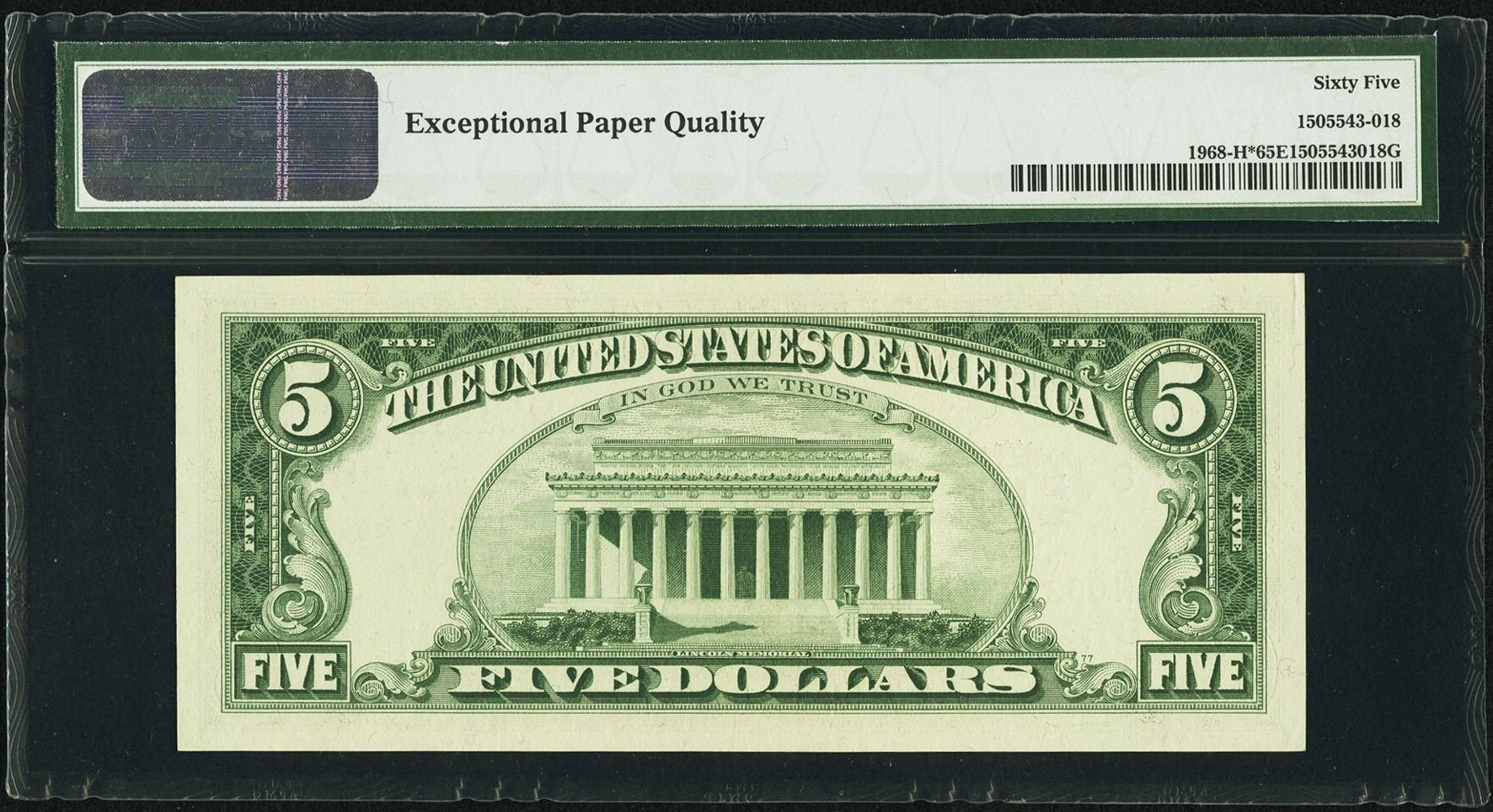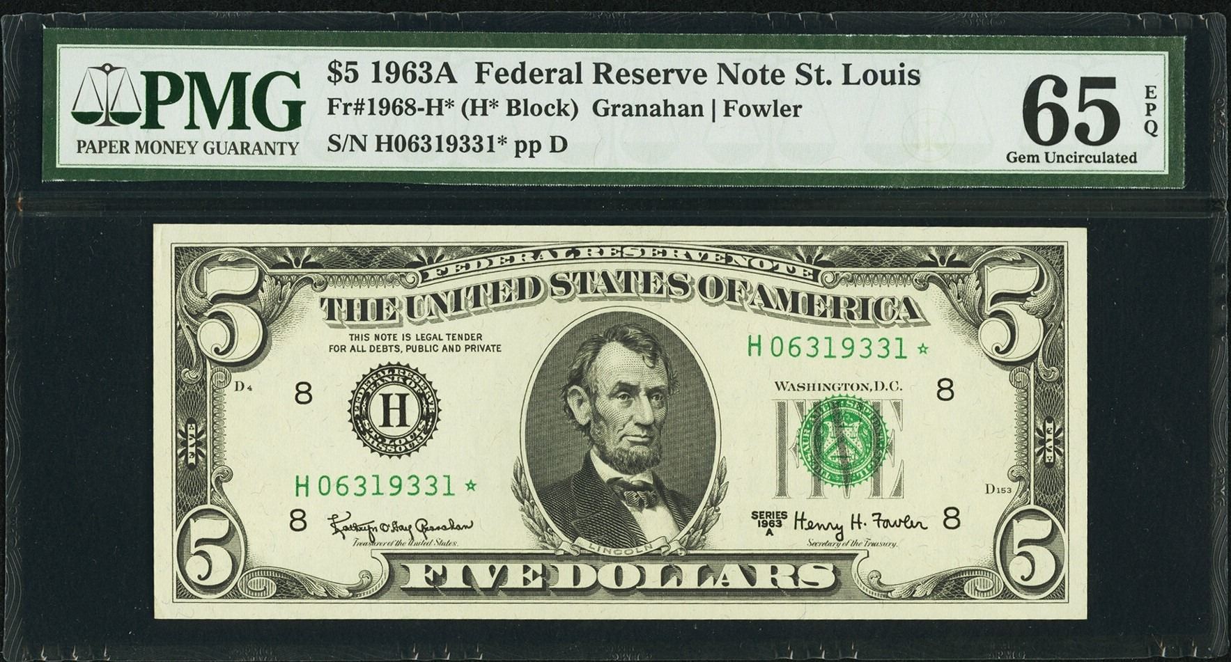 One 1963A $5 St Louis Federal Reserve STAR Note PMG 65EPQ.
