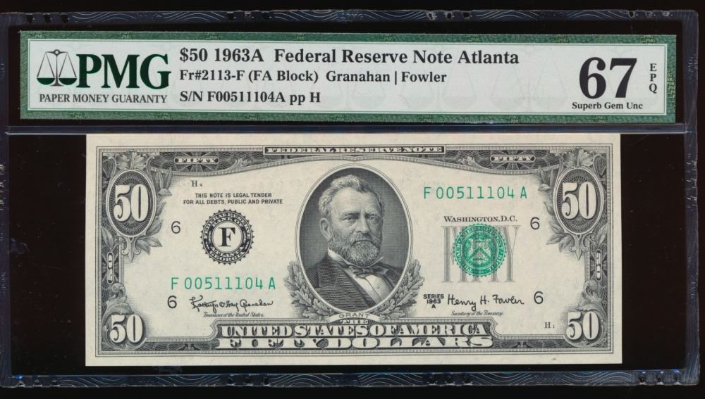 One 1963A $50 Atlanta Federal Reserve Note PMG 67EPQ.