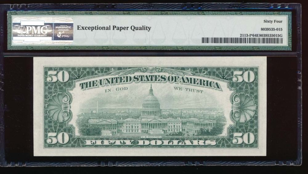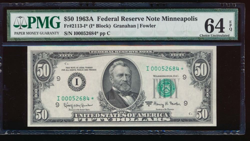 One 1963A $50 Minneapolis Federal Reserve Star Note PMG 64EPQ.