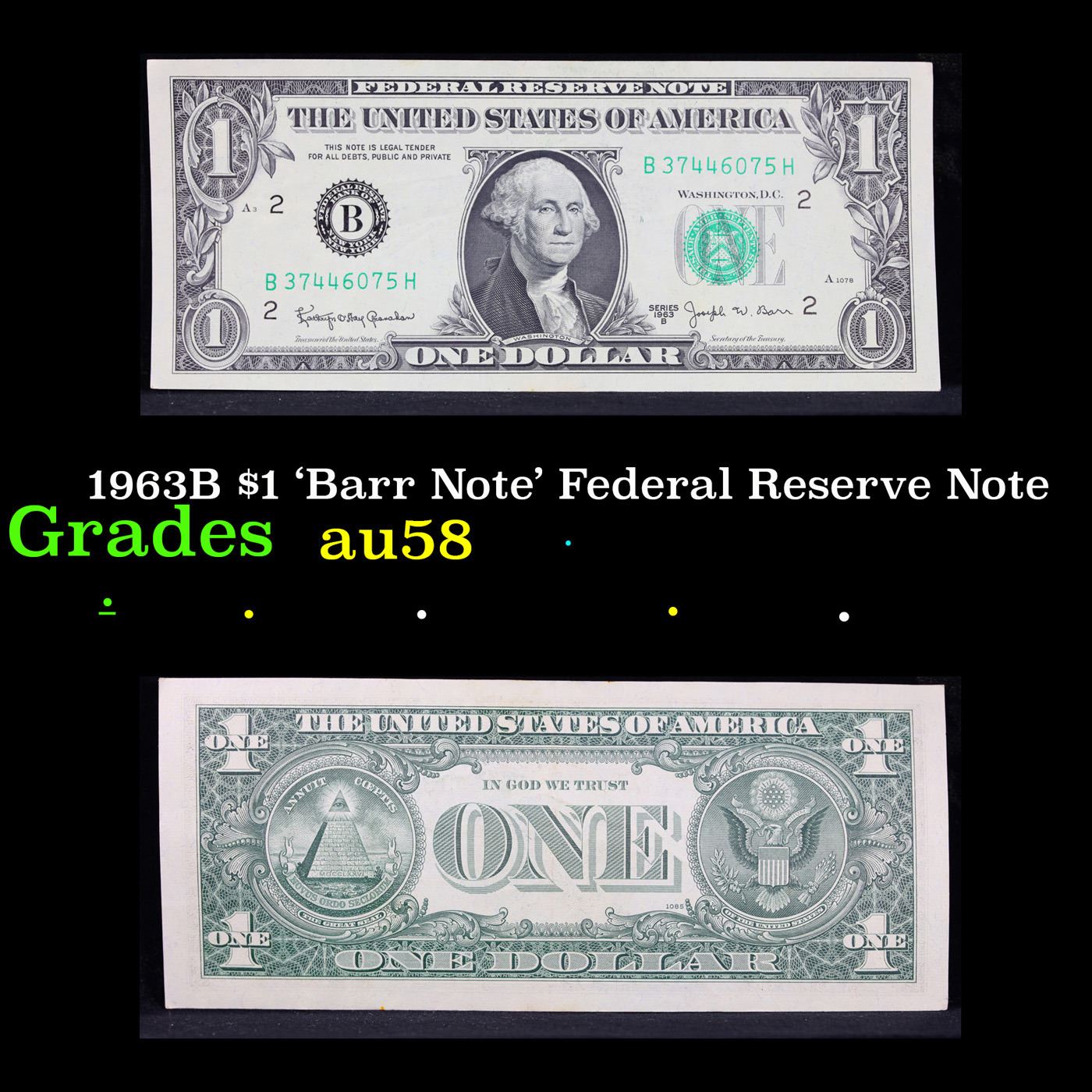 1963B $1 'Barr Note' Federal Reserve Note Grades Choice AU/BU Slider. Among the most sought-after U.S. paper money of the late 1960s are the short-lived "Barr" Notes. These distinctive $1 Federal Reserve Notes bear the signature of Joseph W. Barr, who served as Secretary of the Treasury during the last 28 days of President Lyndon B. Johnson's administration. Barr was replaced when President Nixon chose a successor. Due to Barr's short term, his signature appeared only on the $1 notes of Series 1963B.