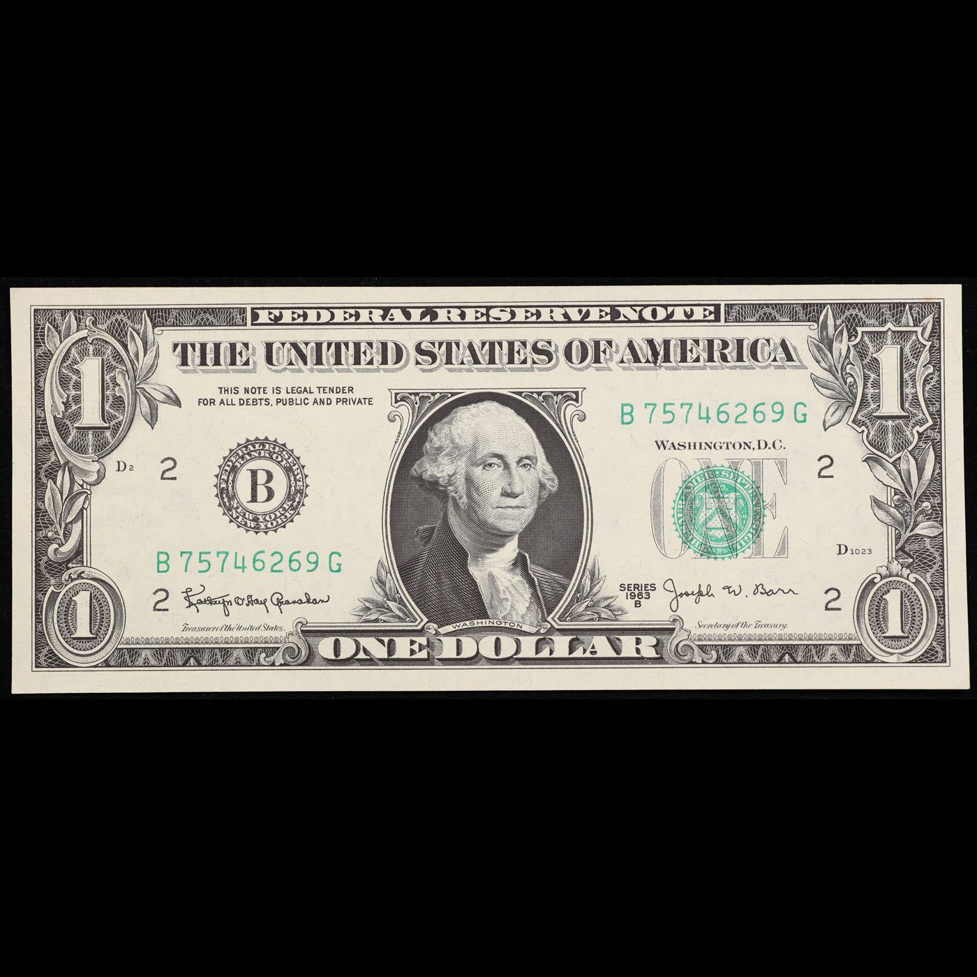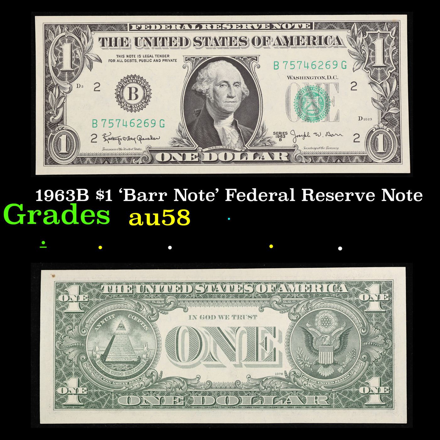 1963B $1 'Barr Note' Federal Reserve Note Grades Choice AU/BU Slider. Among the most sought-after U.S. paper money of the late 1960s are the short-lived "Barr" Notes. These distinctive $1 Federal Reserve Notes bear the signature of Joseph W. Barr, who served as Secretary of the Treasury during the last 28 days of President Lyndon B. Johnson's administration. Barr was replaced when President Nixon chose a successor. Due to Barr's short term, his signature appeared only on the $1 notes of Series 1963B.