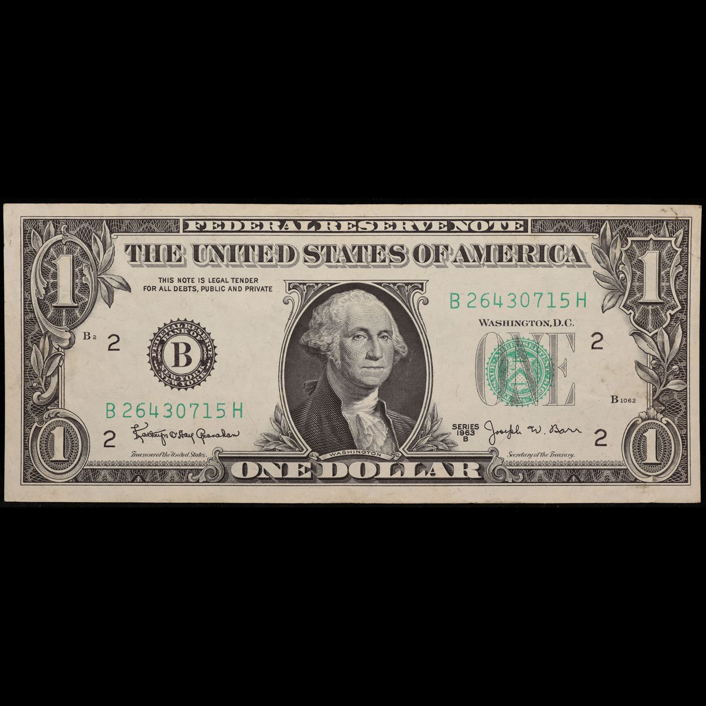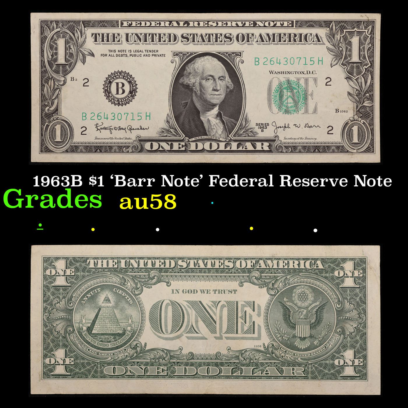 1963B $1 'Barr Note' Federal Reserve Note Grades Choice AU/BU Slider. Among the most sought-after U.S. paper money of the late 1960s are the short-lived "Barr" Notes. These distinctive $1 Federal Reserve Notes bear the signature of Joseph W. Barr, who served as Secretary of the Treasury during the last 28 days of President Lyndon B. Johnson's administration. Barr was replaced when President Nixon chose a successor. Due to Barr's short term, his signature appeared only on the $1 notes of Series 1963B.
