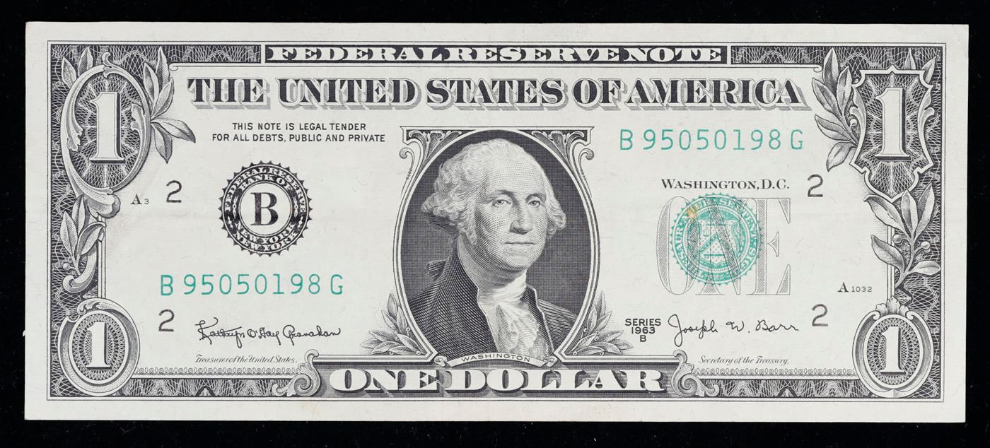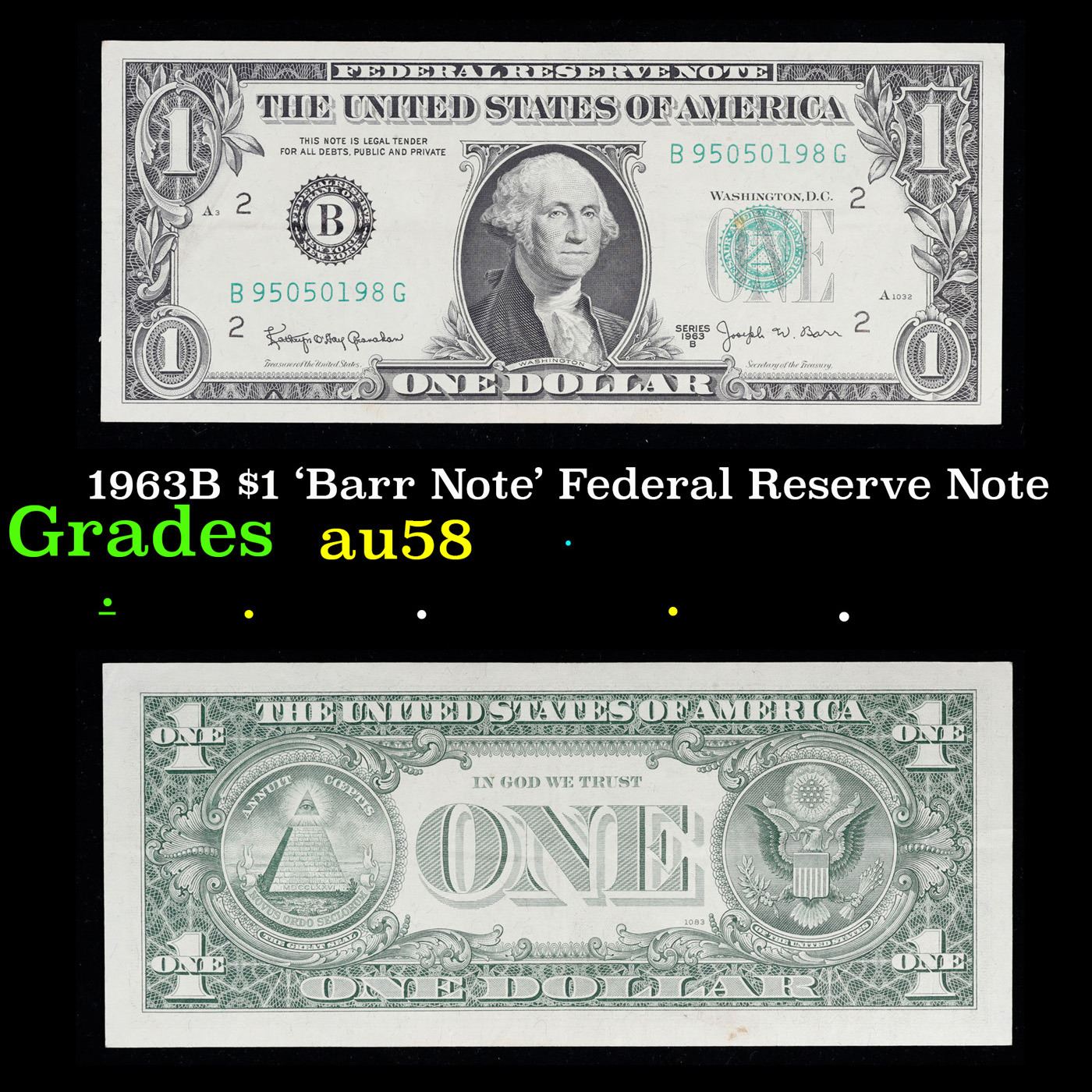 1963B $1 'Barr Note' Federal Reserve Note Grades Choice AU/BU Slider. Among the most sought-after U.S. paper money of the late 1960s are the short-lived "Barr" Notes. These distinctive $1 Federal Reserve Notes bear the signature of Joseph W. Barr, who served as Secretary of the Treasury during the last 28 days of President Lyndon B. Johnson's administration. Barr was replaced when President Nixon chose a successor. Due to Barr's short term, his signature appeared only on the $1 notes of Series 1963B.