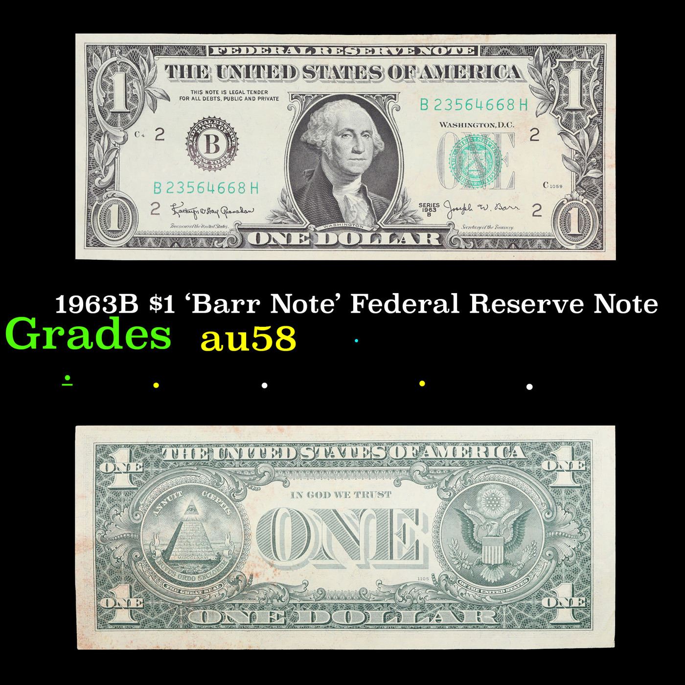 1963B $1 'Barr Note' Federal Reserve Note Grades Choice AU/BU Slider. Among the most sought-after U.S. paper money of the late 1960's are the short-lived "Barr" Notes. These distinctive $1 Federal Reserve Notes bear the signature of Joseph W. Barr, who served as Secretary of the Treasury during the last 28 days of President Lyndon B. Johnson's administration. Barr was replaced when President Nixon chose a successor. Due to Barr's short term, his signature appeared only on the $1 notes of Series 1963B.