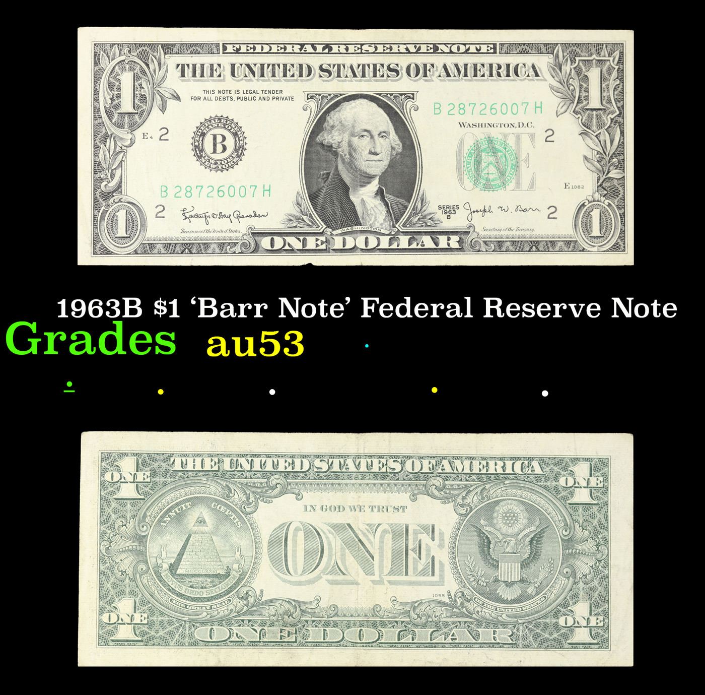 1963B $1 'Barr Note' Federal Reserve Note Grades Select AU. Among the most sought-after U.S. paper money of the late 1960's are the short-lived "Barr" Notes. These distinctive $1 Federal Reserve Notes bear the signature of Joseph W. Barr, who served as Secretary of the Treasury during the last 28 days of President Lyndon B. Johnson's administration. Barr was replaced when President Nixon chose a successor. Due to Barr's short term, his signature appeared only on the $1 notes of Series 1963B.