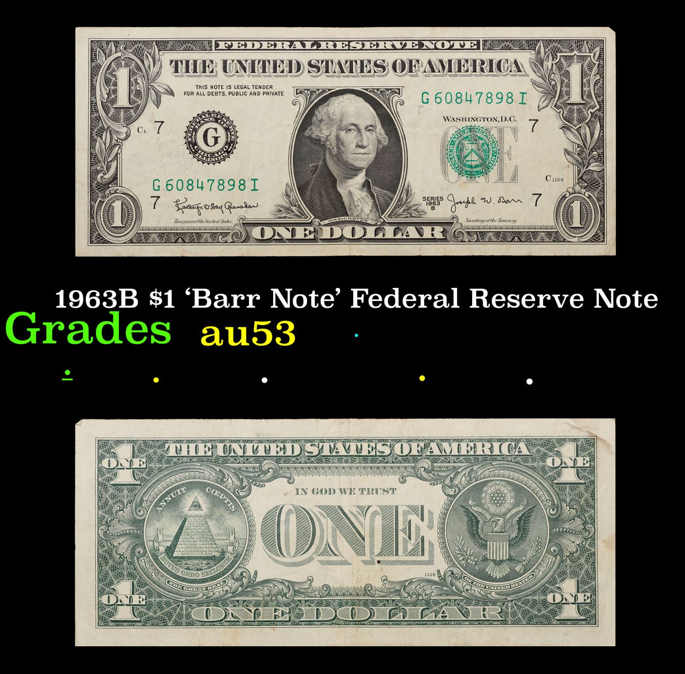 1963B $1 'Barr Note' Federal Reserve Note Grades Select AU. Among the most sought-after U.S. paper money of the late 1960s are the short-lived "Barr" Notes. These distinctive $1 Federal Reserve Notes bear the signature of Joseph W. Barr, who served as Secretary of the Treasury during the last 28 days of President Lyndon B. Johnson's administration. Barr was replaced when President Nixon chose a successor. Due to Barr's short term, his signature appeared only on the $1 notes of Series 1963B.