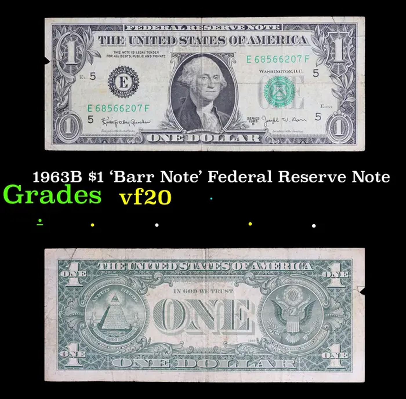 1963B $1 'Barr Note' Federal Reserve Note Grades vf, very fine. Among the most sought-after U.S. paper money of the late 1960's are the short-lived "Barr" Notes. These distinctive $1 Federal Reserve Notes bear the signature of Joseph W. Barr, who served as Secretary of the Treasury during the last 28 days of President Lyndon B. Johnson's administration. Barr was replaced when President Nixon chose a successor. Due to Barr's short term, his signature appeared only on the $1 notes of Series 1963B.