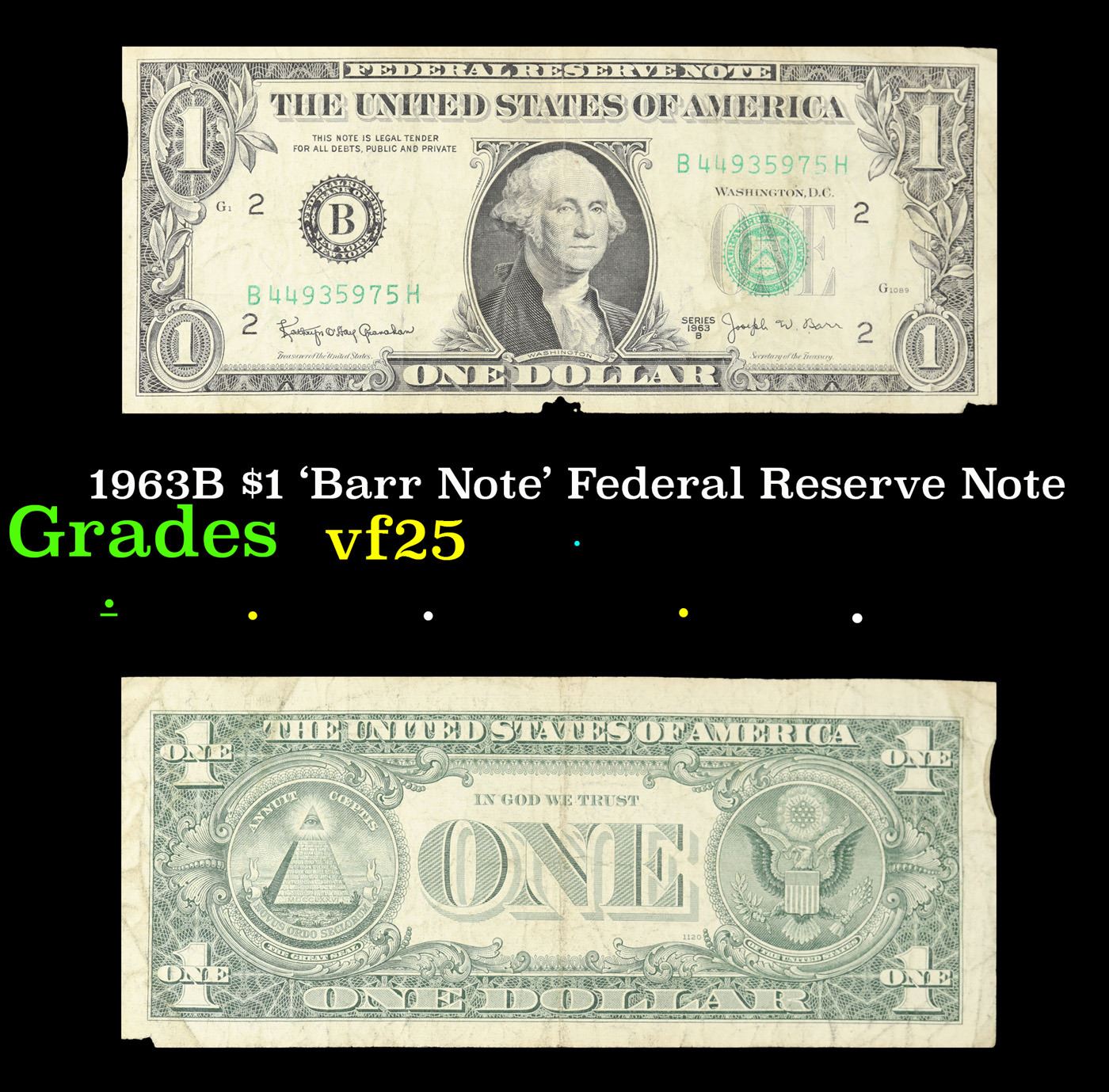 1963B $1 'Barr Note' Federal Reserve Note Grades vf+. Among the most sought-after U.S. paper money of the late 1960's are the short-lived "Barr" Notes. These distinctive $1 Federal Reserve Notes bear the signature of Joseph W. Barr, who served as Secretary of the Treasury during the last 28 days of President Lyndon B. Johnson's administration. Barr was replaced when President Nixon chose a successor. Due to Barr's short term, his signature appeared only on the $1 notes of Series 1963B.