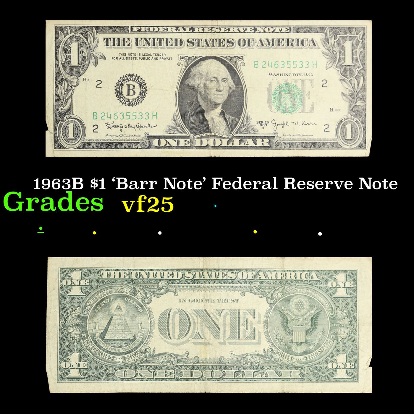 1963B $1 'Barr Note' Federal Reserve Note Grades vf+. Among the most sought-after U.S. paper money of the late 1960's are the short-lived "Barr" Notes. These distinctive $1 Federal Reserve Notes bear the signature of Joseph W. Barr, who served as Secretary of the Treasury during the last 28 days of President Lyndon B. Johnson's administration. Barr was replaced when President Nixon chose a successor. Due to Barr's short term, his signature appeared only on the $1 notes of Series 1963B.