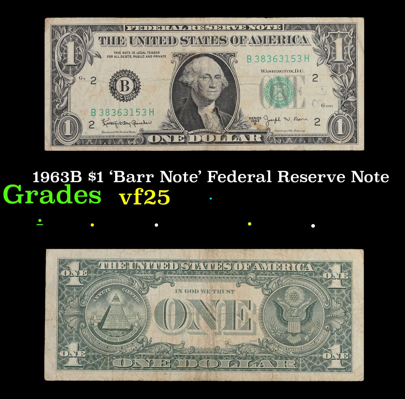 1963B $1 'Barr Note' Federal Reserve Note Grades vf+.