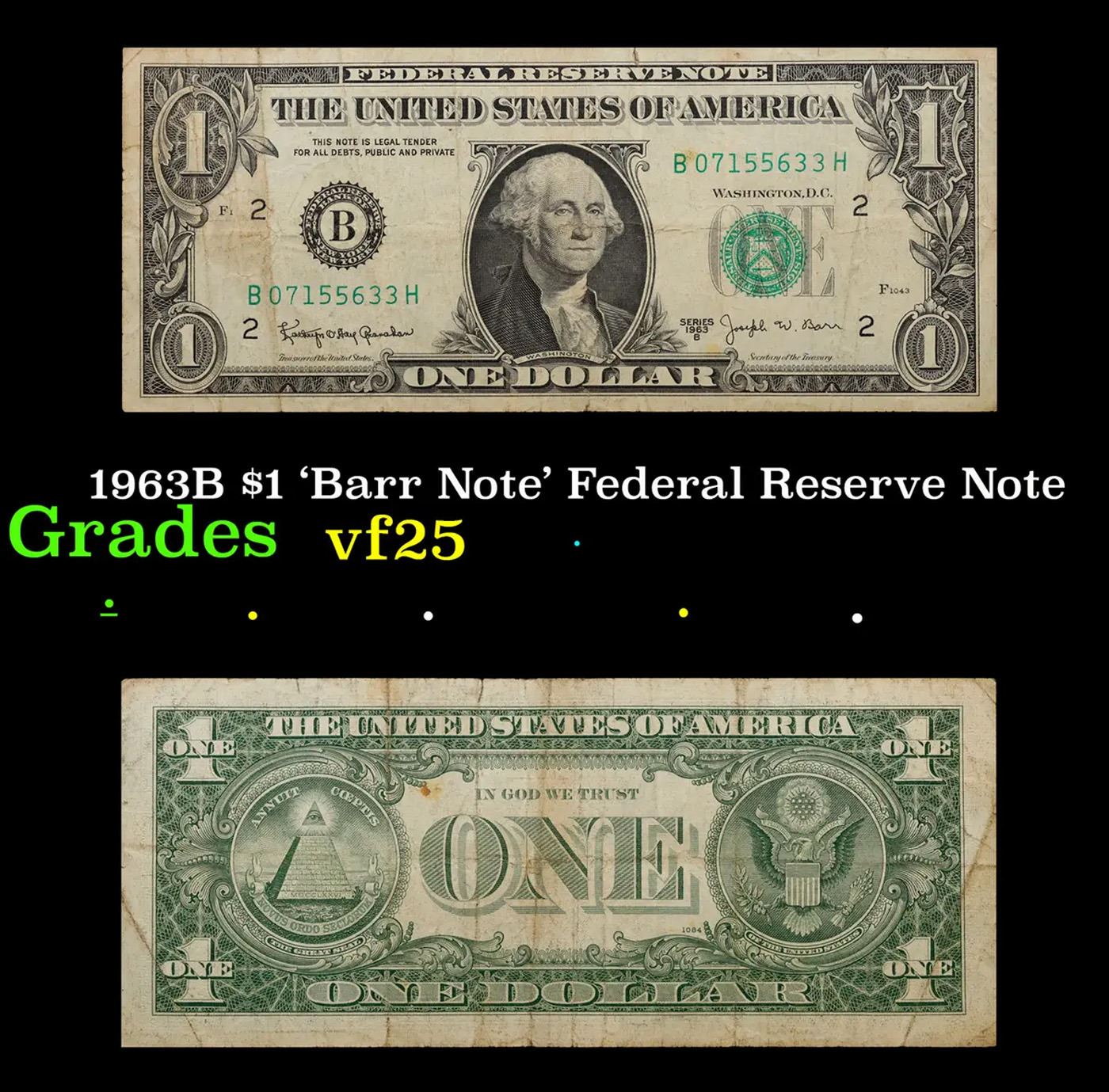 1963B $1 'Barr Note' Federal Reserve Note Grades vf+.