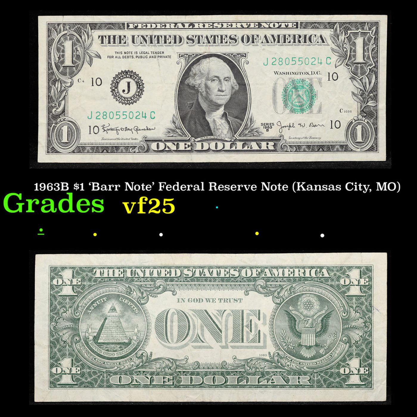 1963B $1 'Barr Note' Federal Reserve Note (Kansas City, MO) Grades vf+