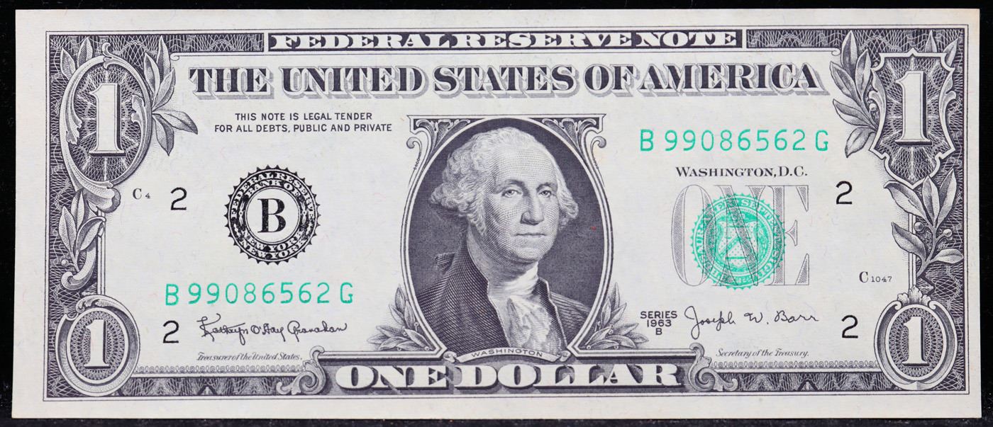 1963B $1 'Barr Note' Federal Reserve Note (New York, NY) FR-1902B Grades Choice AU/BU Slider. Among the most sought-after U.S. paper money of the late 1960s are the short-lived "Barr" Notes. These distinctive $1 Federal Reserve Notes bear the signature of Joseph W. Barr, who served as Secretary of the Treasury during the last 28 days of President Lyndon B. Johnson's administration. Barr was replaced when President Nixon chose a successor. Due to Barr's short term, his signature appeared only on the $1 notes of Series 1963B.