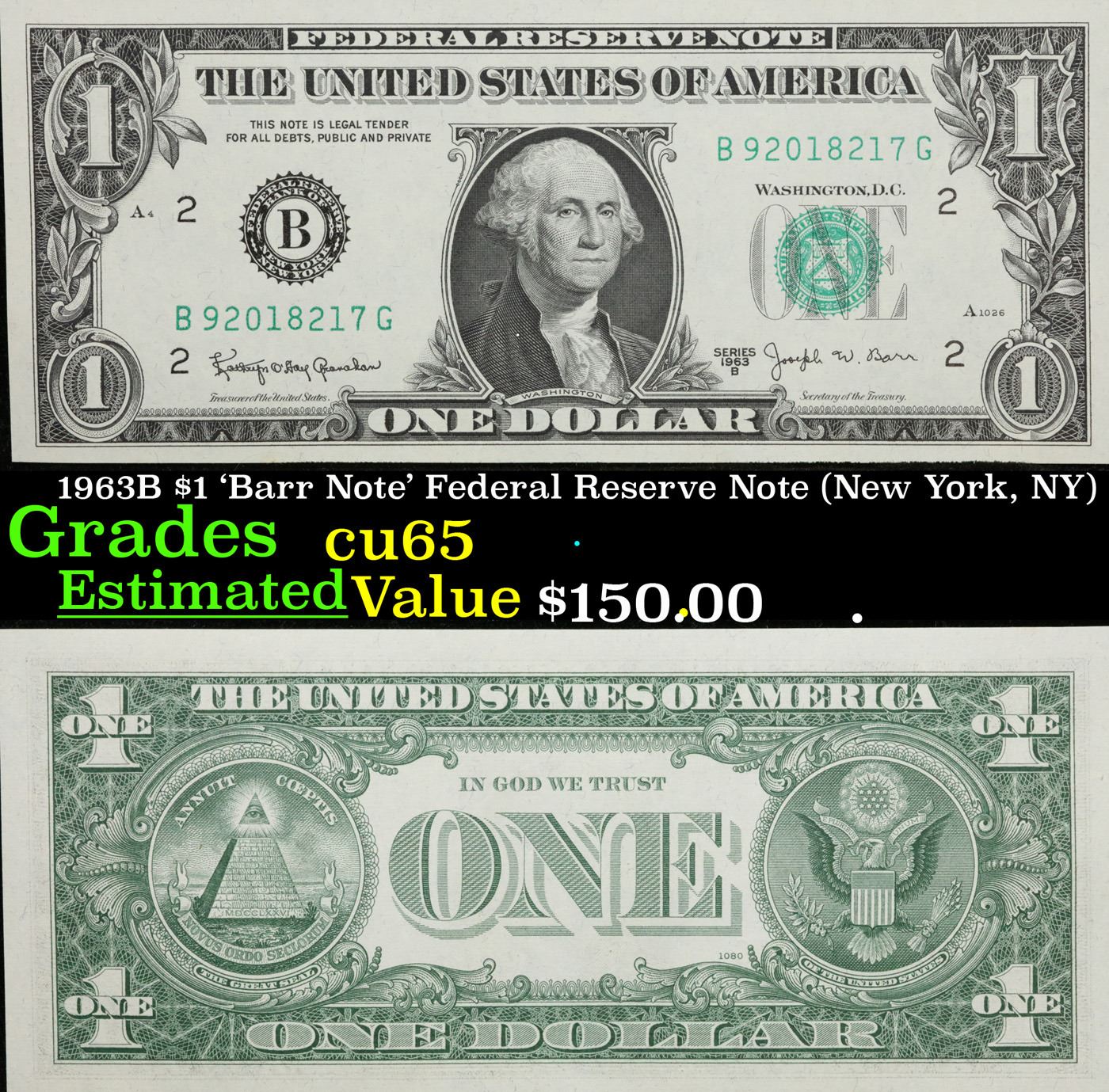 1963B $1 'Barr Note' Federal Reserve Note (New York, NY) Grades Gem CU