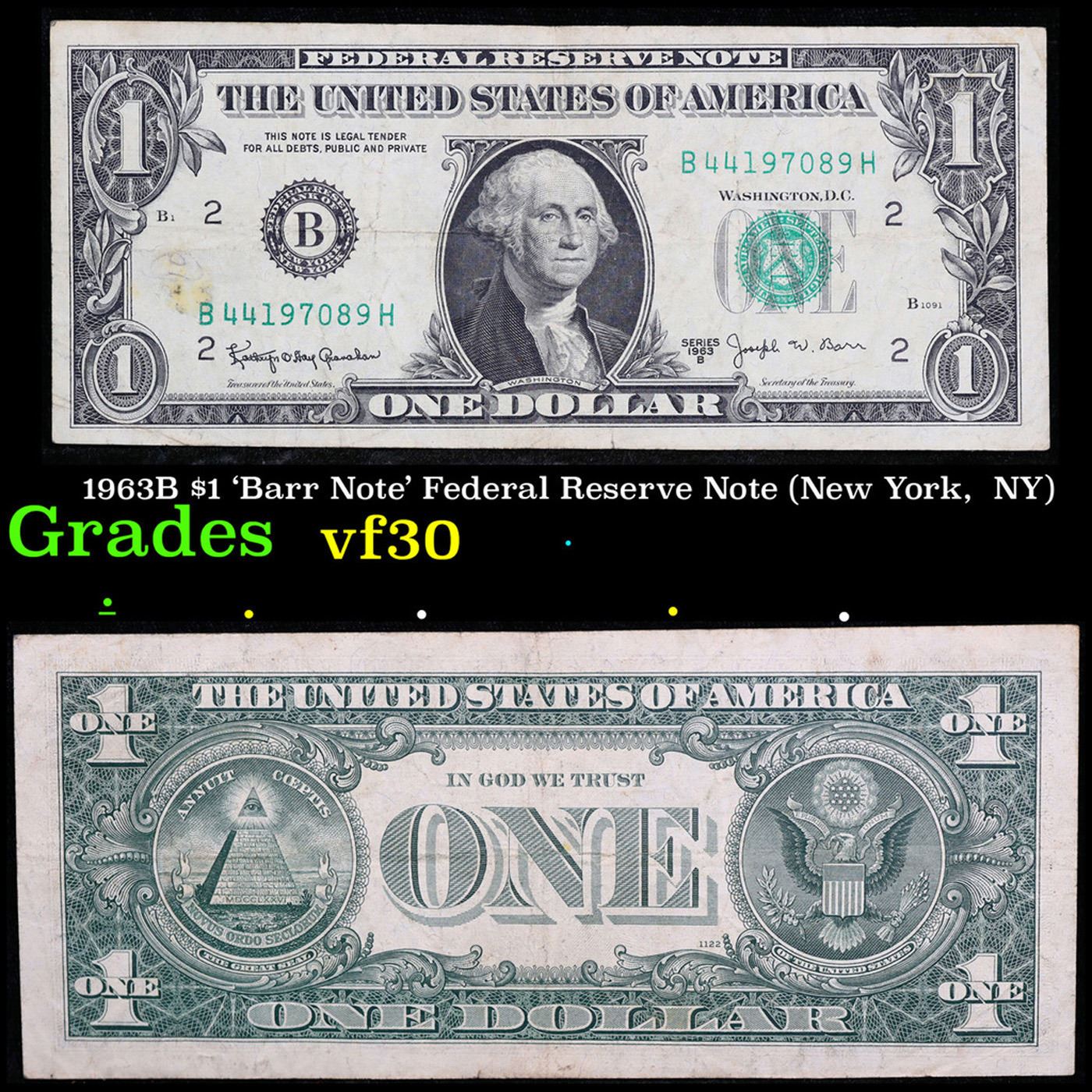 1963B $1 'Barr Note' Federal Reserve Note (New York, NY) Grades vf++