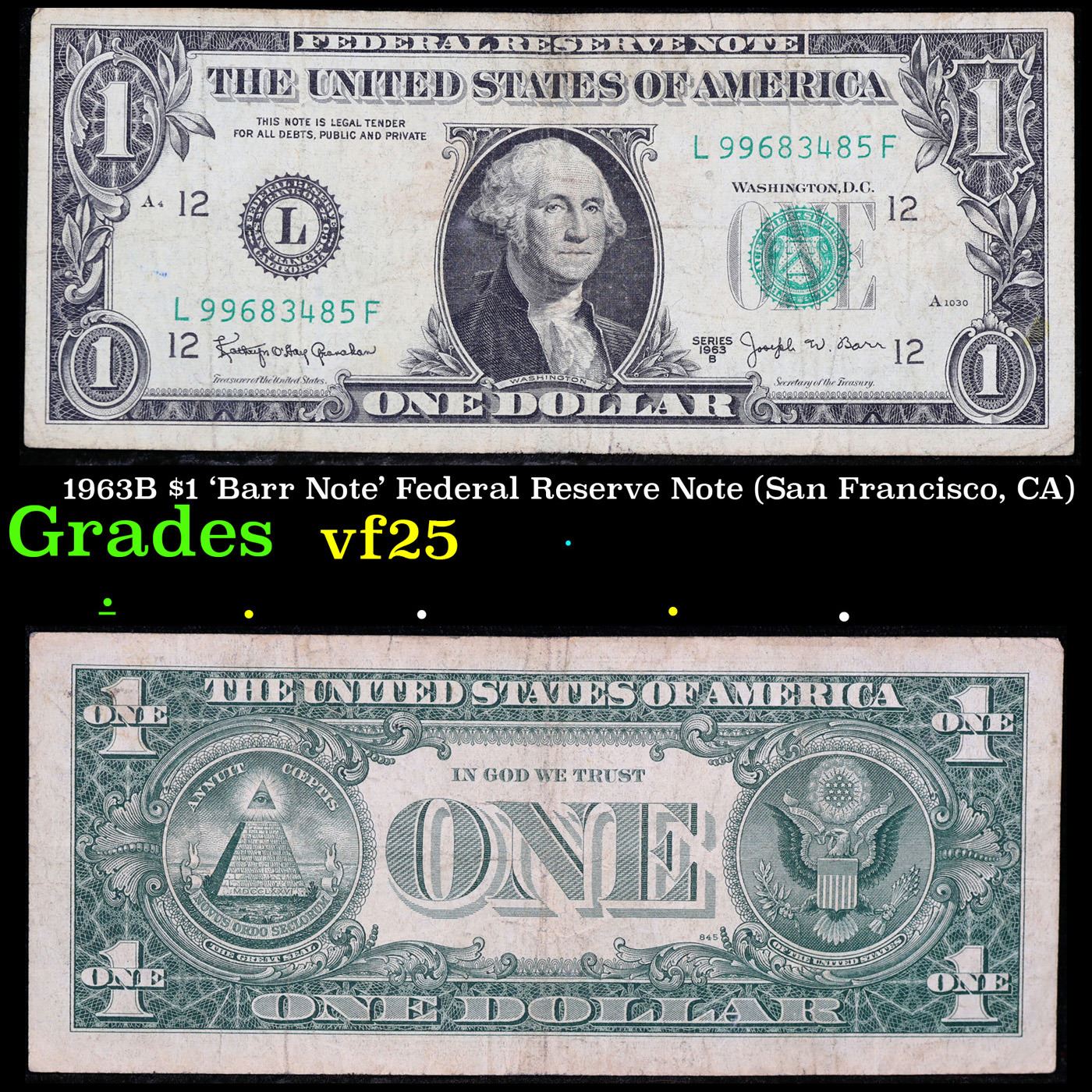 1963B $1 'Barr Note' Federal Reserve Note (San Francisco, CA) Grades vf+