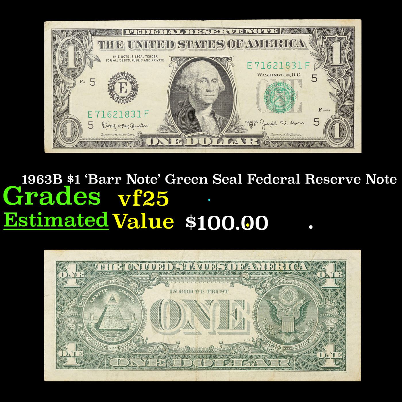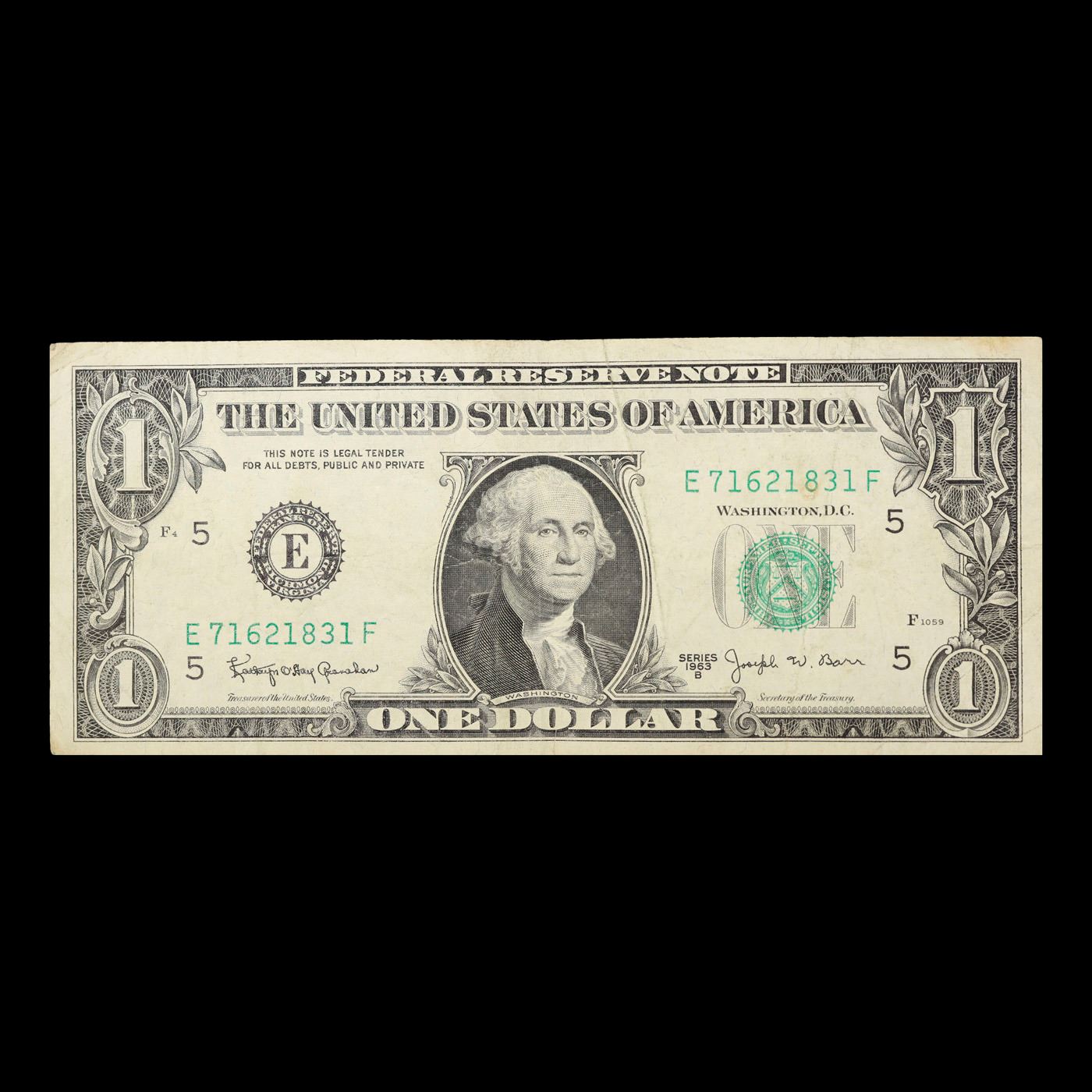 1963B $1 'Barr Note' Green Seal Federal Reserve Note Grades vf+. 0 Among the most sought-after U.S. paper money of the late 1960s are the short-lived "Barr" Notes. These distinctive $1 Federal Reserve Notes bear the signature of Joseph W. Barr, who served as Secretary of the Treasury during the last 28 days of President Lyndon B. Johnson's administration. Barr was replaced when President Nixon chose a successor. Due to Barr's short term, his signature appeared only on the $1 notes of Series 1963B.