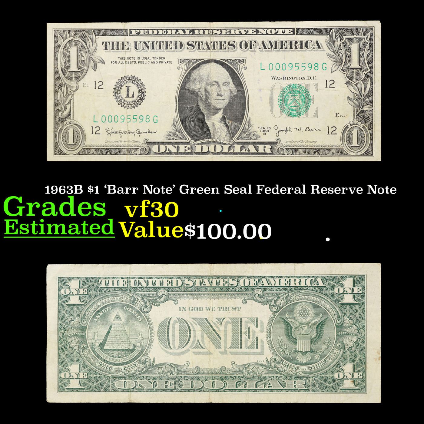 1963B $1 'Barr Note' Green Seal Federal Reserve Note Grades vf++. 0 Among the most sought-after U.S. paper money of the late 1960s are the short-lived "Barr" Notes. These distinctive $1 Federal Reserve Notes bear the signature of Joseph W. Barr, who served as Secretary of the Treasury during the last 28 days of President Lyndon B. Johnson's administration. Barr was replaced when President Nixon chose a successor. Due to Barr's short term, his signature appeared only on the $1 notes of Series 1963B.