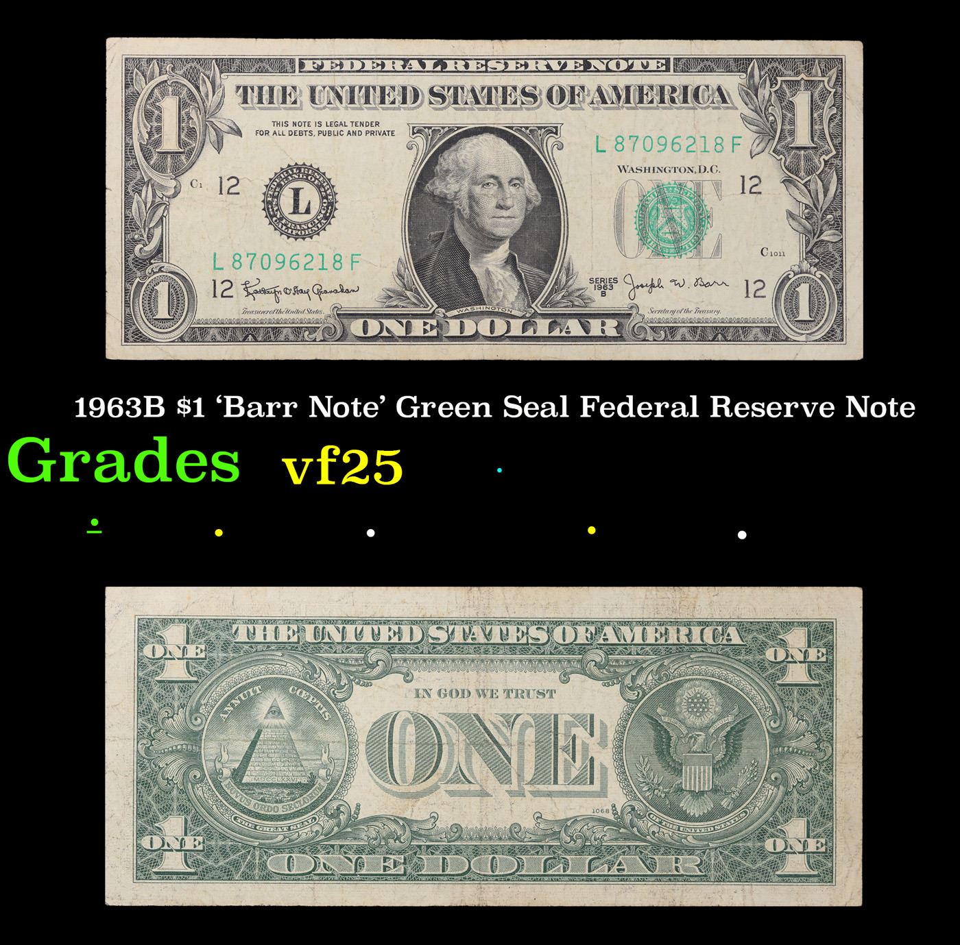 1963B $1 'Barr Note' Green Seal Federal Reserve Note Grades vf+. Among the most sought-after U.S. paper money of the late 1960's are the short-lived "Barr" Notes. These distinctive $1 Federal Reserve Notes bear the signature of Joseph W. Barr, who served as Secretary of the Treasury during the last 28 days of President Lyndon B. Johnson's administration. Barr was replaced when President Nixon chose a successor. Due to Barr's short term, his signature appeared only on the $1 notes of Series 1963B.