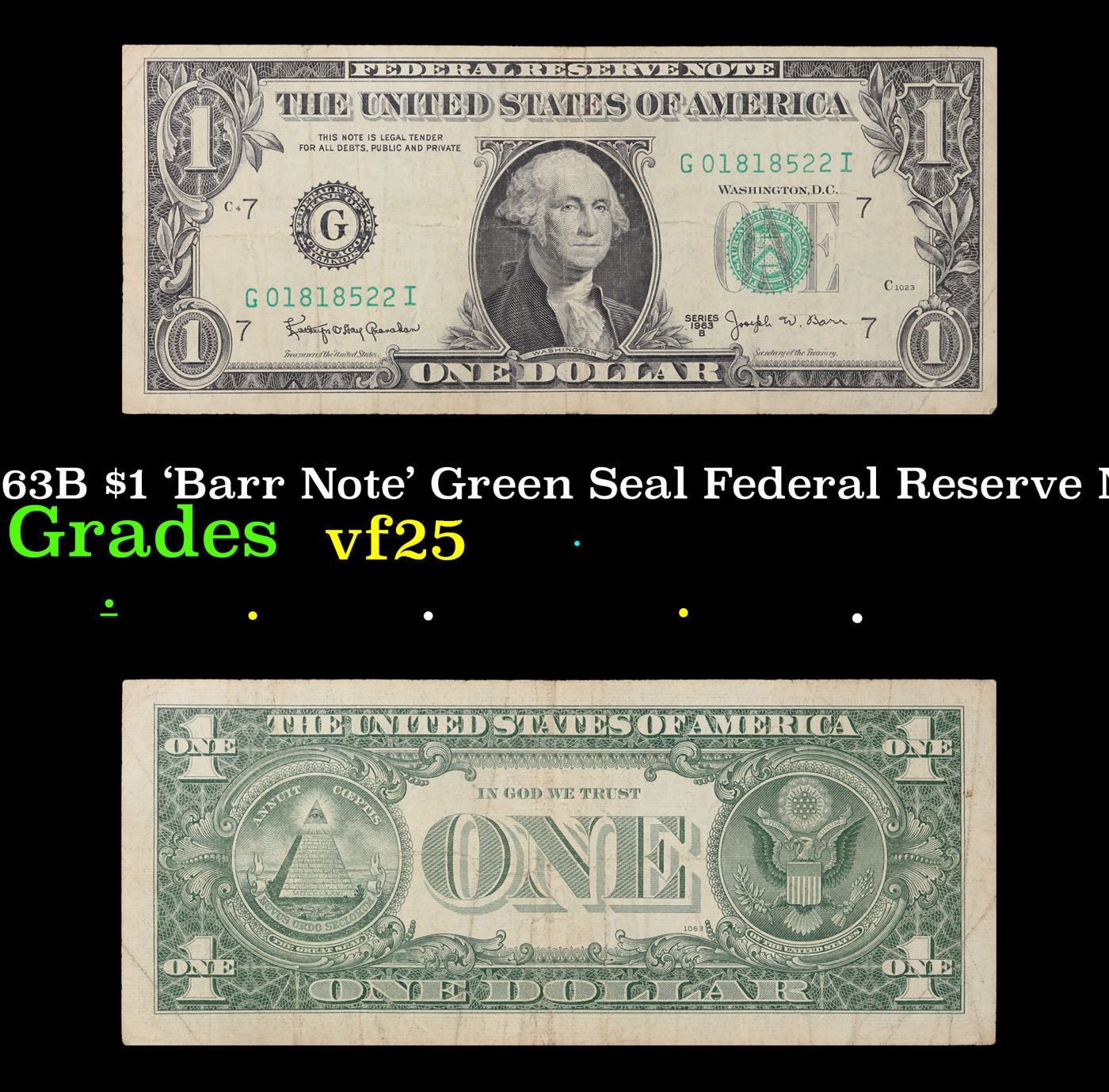 1963B $1 'Barr Note' Green Seal Federal Reserve Note Grades vf+. Among the most sought-after U.S. paper money of the late 1960's are the short-lived "Barr" Notes. These distinctive $1 Federal Reserve Notes bear the signature of Joseph W. Barr, who served as Secretary of the Treasury during the last 28 days of President Lyndon B. Johnson's administration. Barr was replaced when President Nixon chose a successor. Due to Barr's short term, his signature appeared only on the $1 notes of Series 1963B.