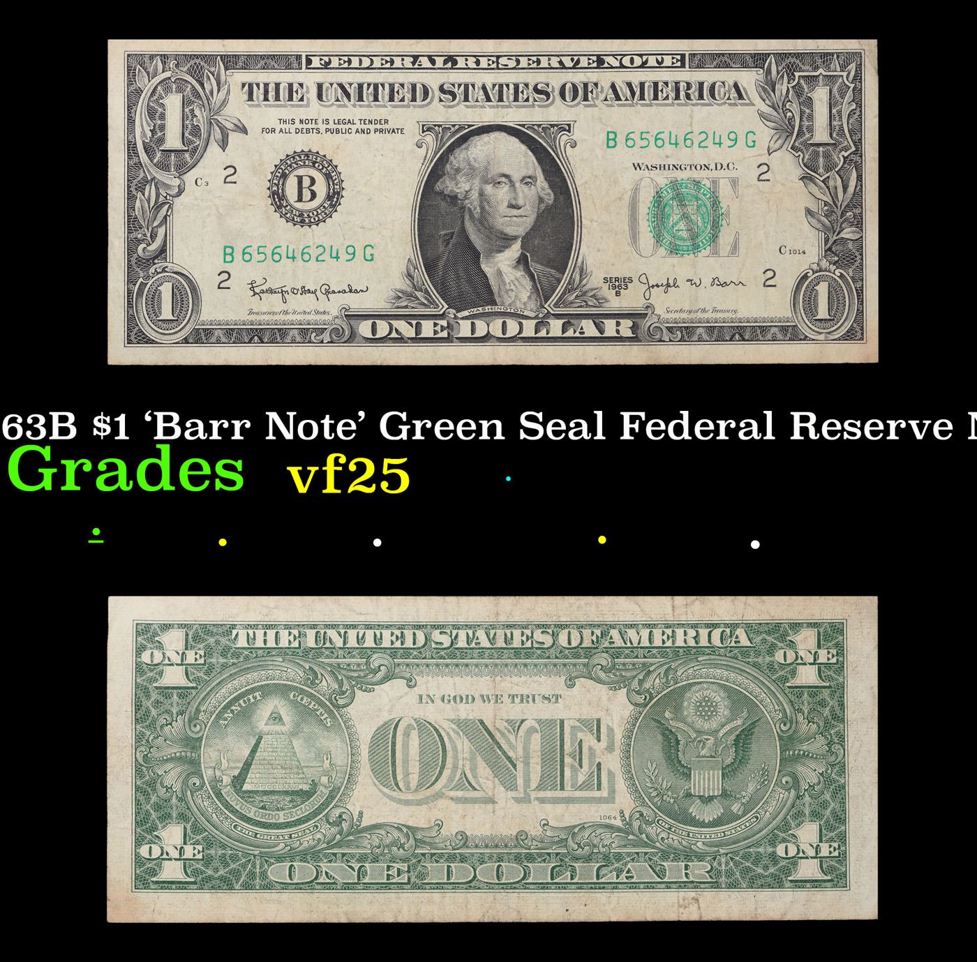 1963B $1 'Barr Note' Green Seal Federal Reserve Note Grades vf+. Among the most sought-after U.S. paper money of the late 1960's are the short-lived "Barr" Notes. These distinctive $1 Federal Reserve Notes bear the signature of Joseph W. Barr, who served as Secretary of the Treasury during the last 28 days of President Lyndon B. Johnson's administration. Barr was replaced when President Nixon chose a successor. Due to Barr's short term, his signature appeared only on the $1 notes of Series 1963B.