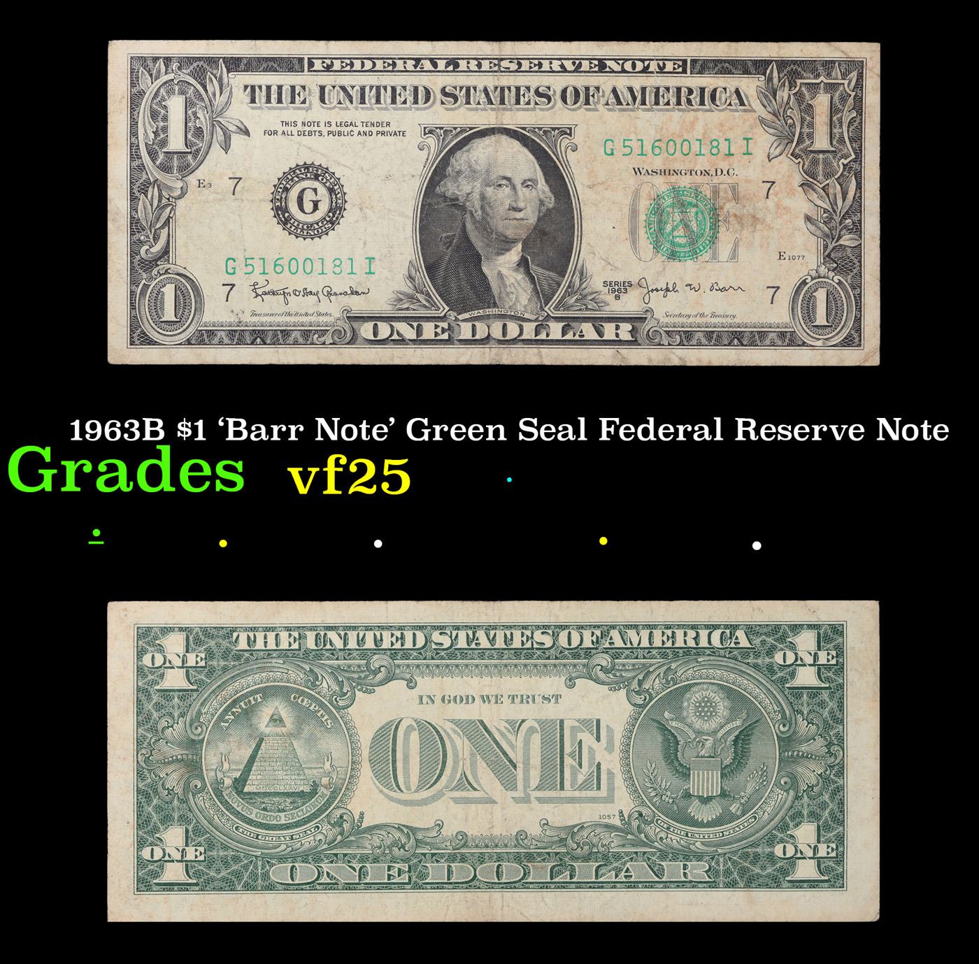 1963B $1 'Barr Note' Green Seal Federal Reserve Note Grades vf+. Among the most sought-after U.S. paper money of the late 1960's are the short-lived "Barr" Notes. These distinctive $1 Federal Reserve Notes bear the signature of Joseph W. Barr, who served as Secretary of the Treasury during the last 28 days of President Lyndon B. Johnson's administration. Barr was replaced when President Nixon chose a successor. Due to Barr's short term, his signature appeared only on the $1 notes of Series 1963B.