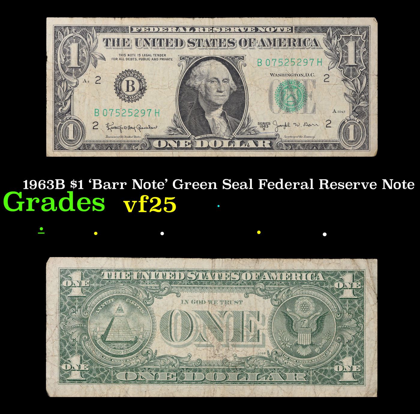 1963B $1 'Barr Note' Green Seal Federal Reserve Note Grades vf+. Among the most sought-after U.S. paper money of the late 1960's are the short-lived "Barr" Notes. These distinctive $1 Federal Reserve Notes bear the signature of Joseph W. Barr, who served as Secretary of the Treasury during the last 28 days of President Lyndon B. Johnson's administration. Barr was replaced when President Nixon chose a successor. Due to Barr's short term, his signature appeared only on the $1 notes of Series 1963B.