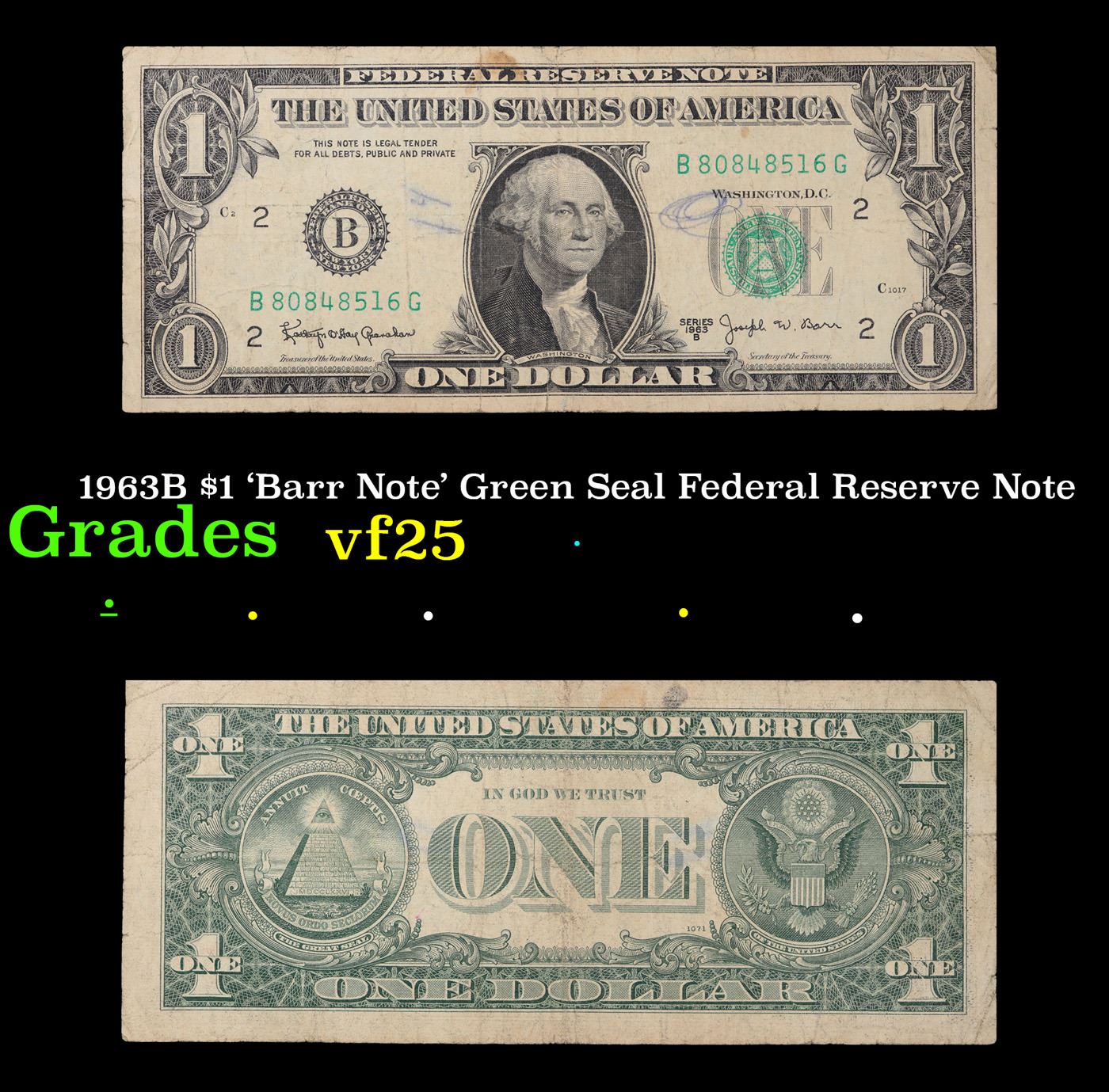 1963B $1 'Barr Note' Green Seal Federal Reserve Note Grades vf+