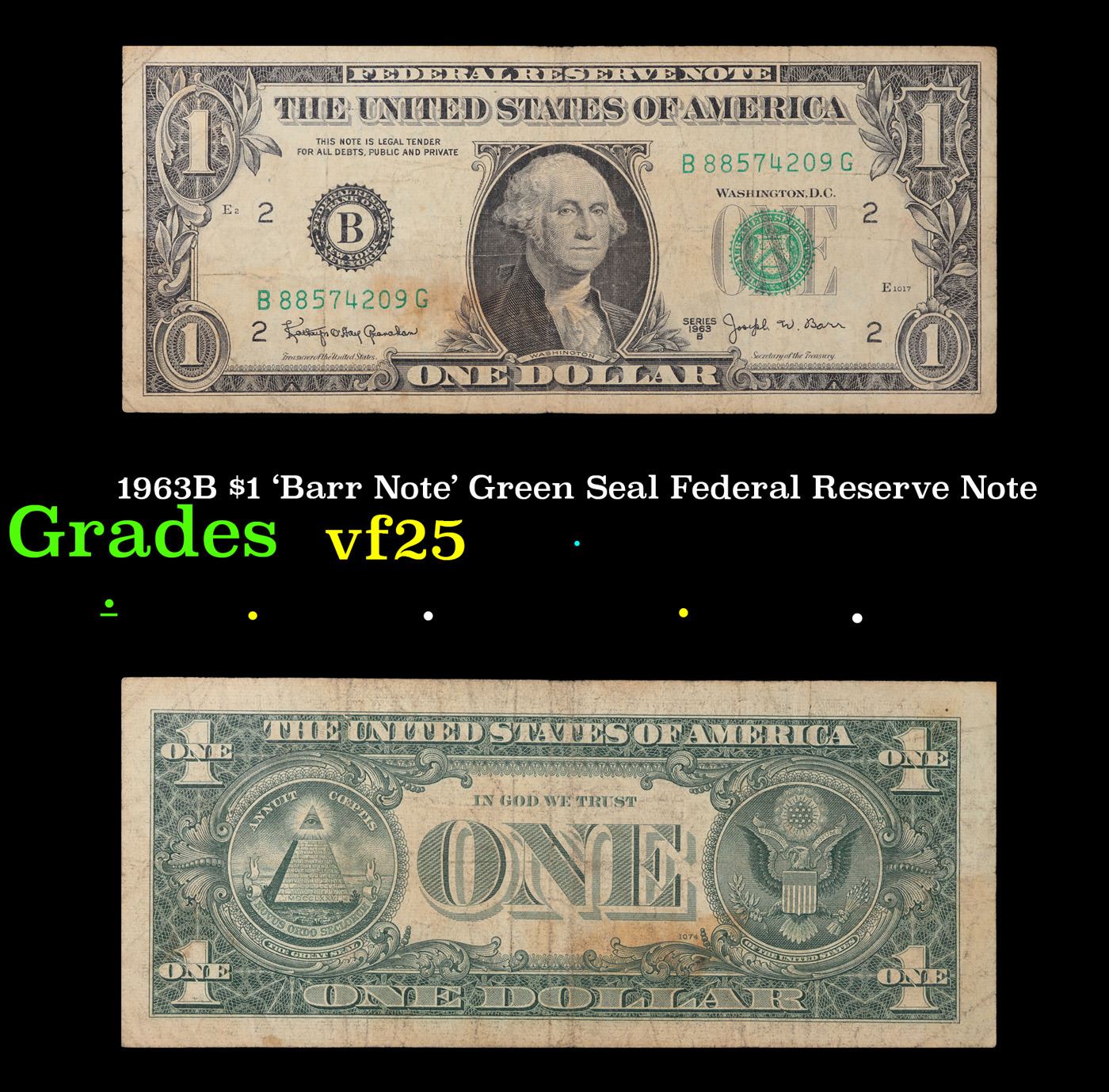 1963B $1 'Barr Note' Green Seal Federal Reserve Note Grades vf+