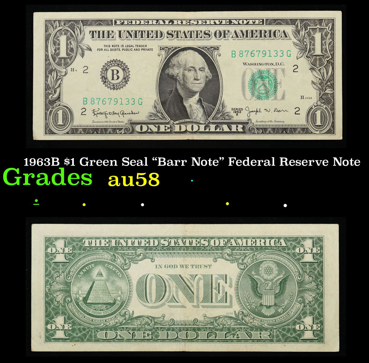 1963B $1 Green Seal "Barr Note" Federal Reserve Note Grades Choice AU/BU Slider. Among the most sought-after U.S. paper money of the late 1960s are the short-lived "Barr" Notes. These distinctive $1 Federal Reserve Notes bear the signature of Joseph W. Barr, who served as Secretary of the Treasury during the last 28 days of President Lyndon B. Johnson's administration. Barr was replaced when President Nixon chose a successor. Due to Barr's short term, his signature appeared only on the $1 notes of Series 1963B.