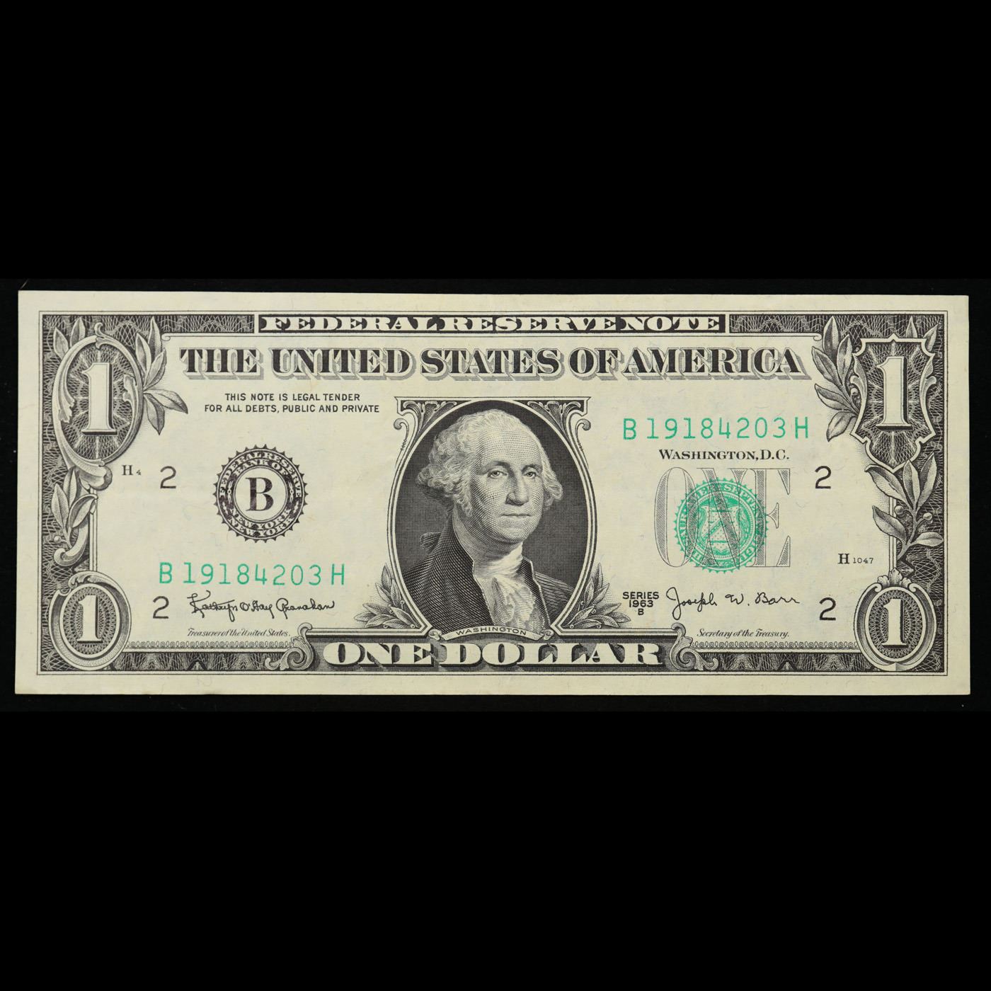 1963B $1 Green Seal "Barr Note" Federal Reserve Note Grades Choice AU/BU Slider. Among the most sought-after U.S. paper money of the late 1960s are the short-lived "Barr" Notes. These distinctive $1 Federal Reserve Notes bear the signature of Joseph W. Barr, who served as Secretary of the Treasury during the last 28 days of President Lyndon B. Johnson's administration. Barr was replaced when President Nixon chose a successor. Due to Barr's short term, his signature appeared only on the $1 notes of Series 1963B.