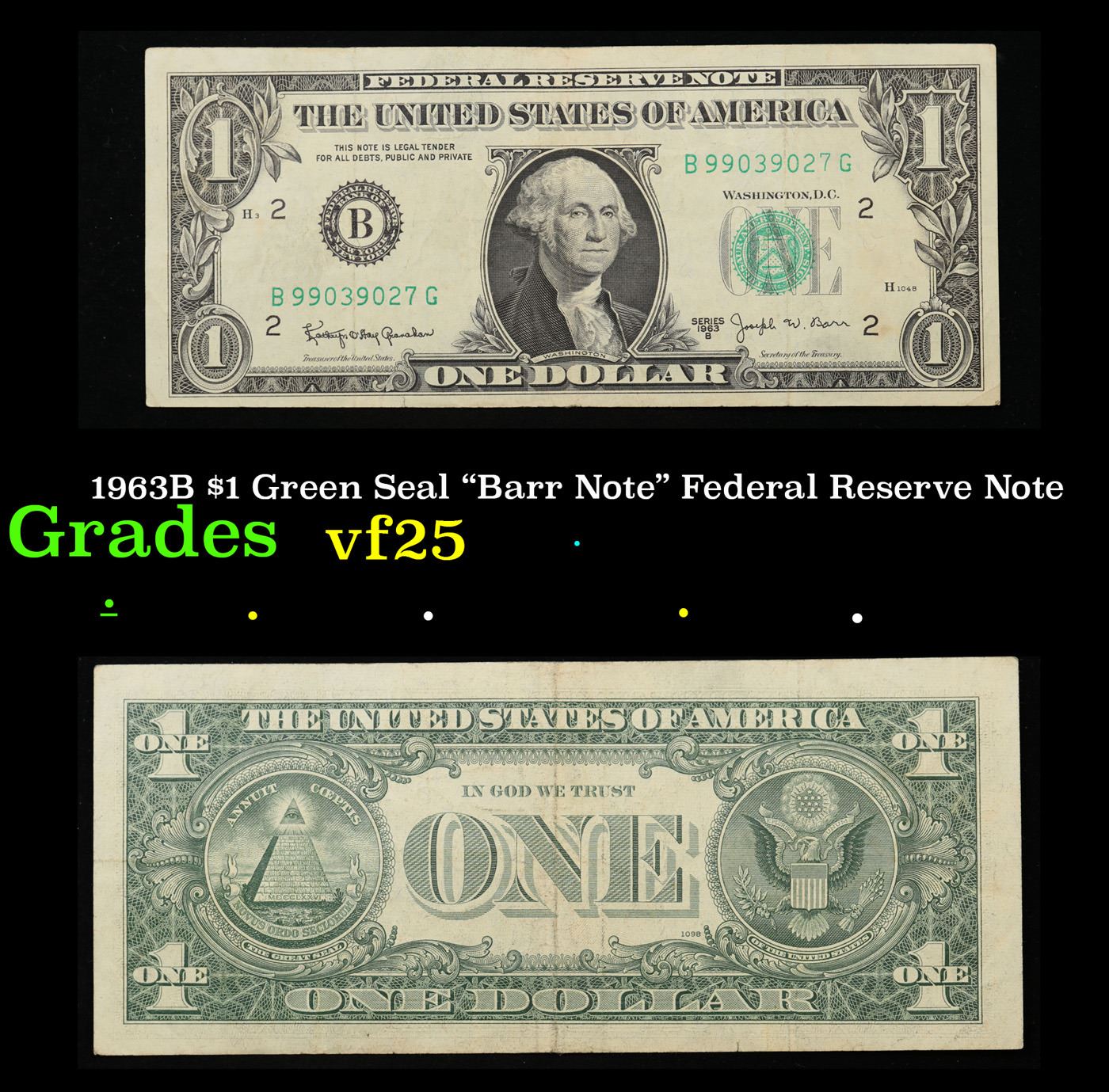 1963B $1 Green Seal "Barr Note" Federal Reserve Note Grades vf+. Among the most sought-after U.S. paper money of the late 1960s are the short-lived "Barr" Notes. These distinctive $1 Federal Reserve Notes bear the signature of Joseph W. Barr, who served as Secretary of the Treasury during the last 28 days of President Lyndon B. Johnson's administration. Barr was replaced when President Nixon chose a successor. Due to Barr's short term, his signature appeared only on the $1 notes of Series 1963B.