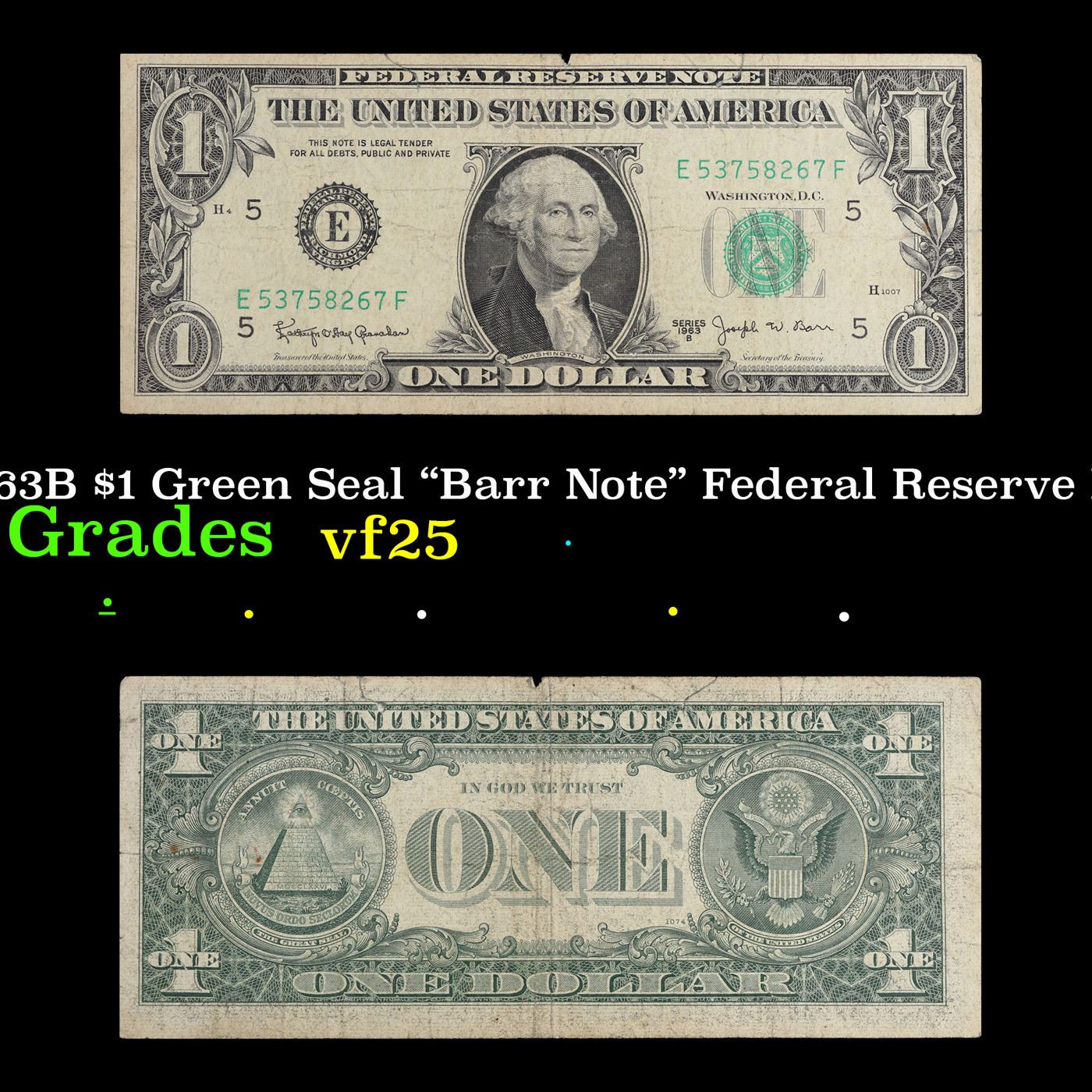 1963B $1 Green Seal "Barr Note" Federal Reserve Note Grades vf+. Among the most sought-after U.S. paper money of the late 1960s are the short-lived "Barr" Notes. These distinctive $1 Federal Reserve Notes bear the signature of Joseph W. Barr, who served as Secretary of the Treasury during the last 28 days of President Lyndon B. Johnson's administration. Barr was replaced when President Nixon chose a successor. Due to Barr's short term, his signature appeared only on the $1 notes of Series 1963B.