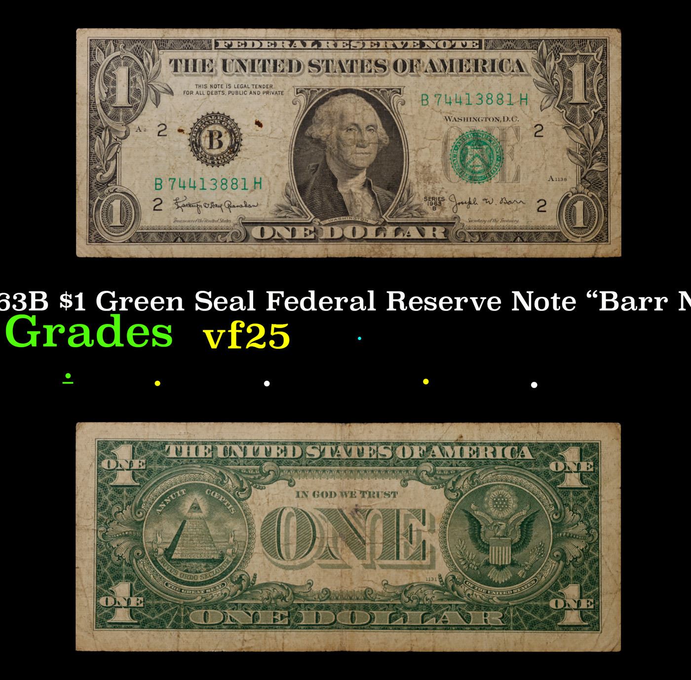 1963B "Barr Note" $1 Green Seal Federal Reserve Note Grades vf+. Among the most sought-after U.S. paper money of the late 1960s are the short-lived "Barr" Notes. These distinctive $1 Federal Reserve Notes bear the signature of Joseph W. Barr, who served as Secretary of the Treasury during the last 28 days of President Lyndon B. Johnson's administration. Barr was replaced when President Nixon chose a successor. Due to Barr's short term, his signature appeared only on the $1 notes of Series 1963B.