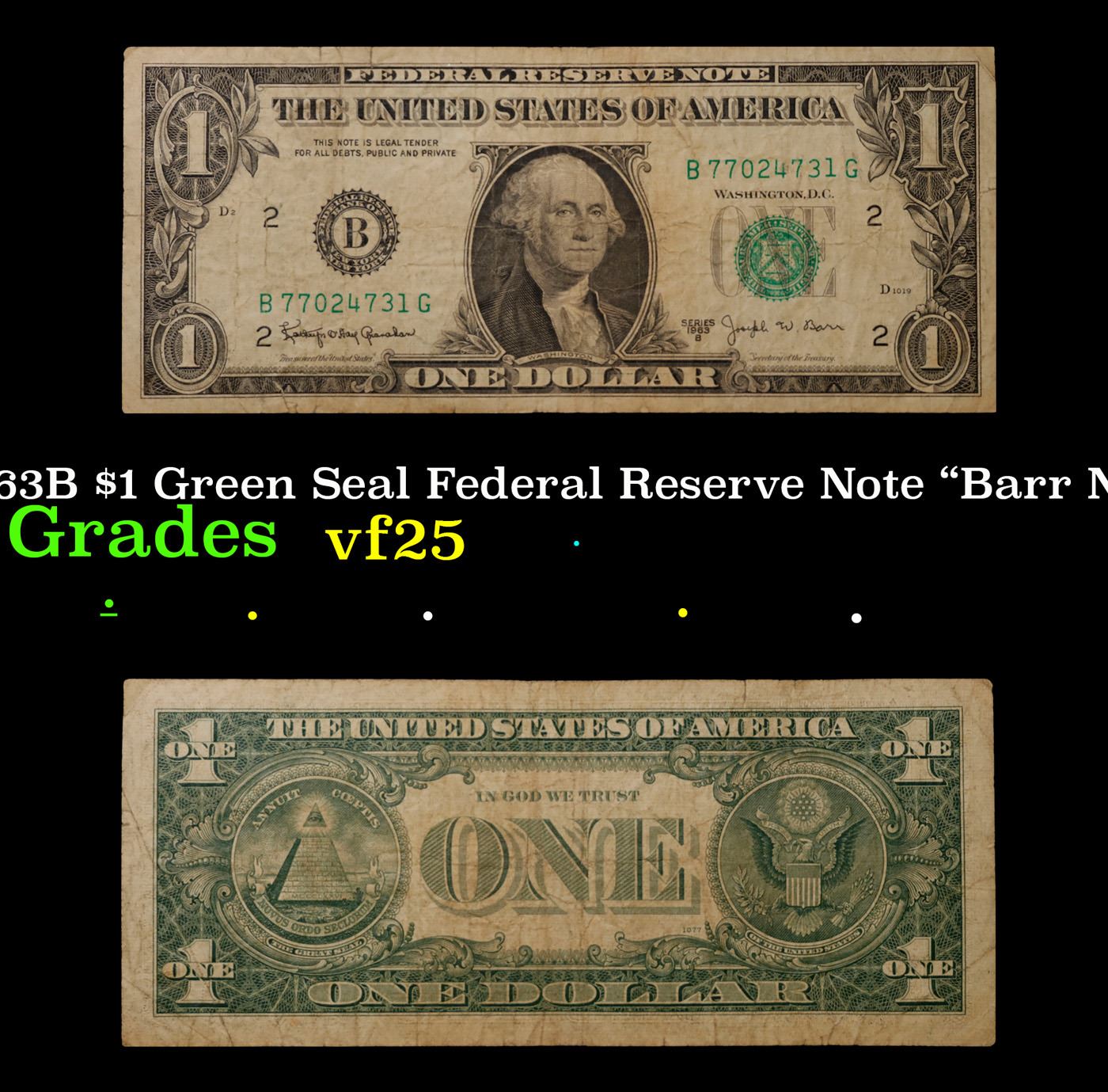 1963B "Barr Note" $1 Green Seal Federal Reserve Note Grades vf+. Among the most sought-after U.S. paper money of the late 1960s are the short-lived "Barr" Notes. These distinctive $1 Federal Reserve Notes bear the signature of Joseph W. Barr, who served as Secretary of the Treasury during the last 28 days of President Lyndon B. Johnson's administration. Barr was replaced when President Nixon chose a successor. Due to Barr's short term, his signature appeared only on the $1 notes of Series 1963B.