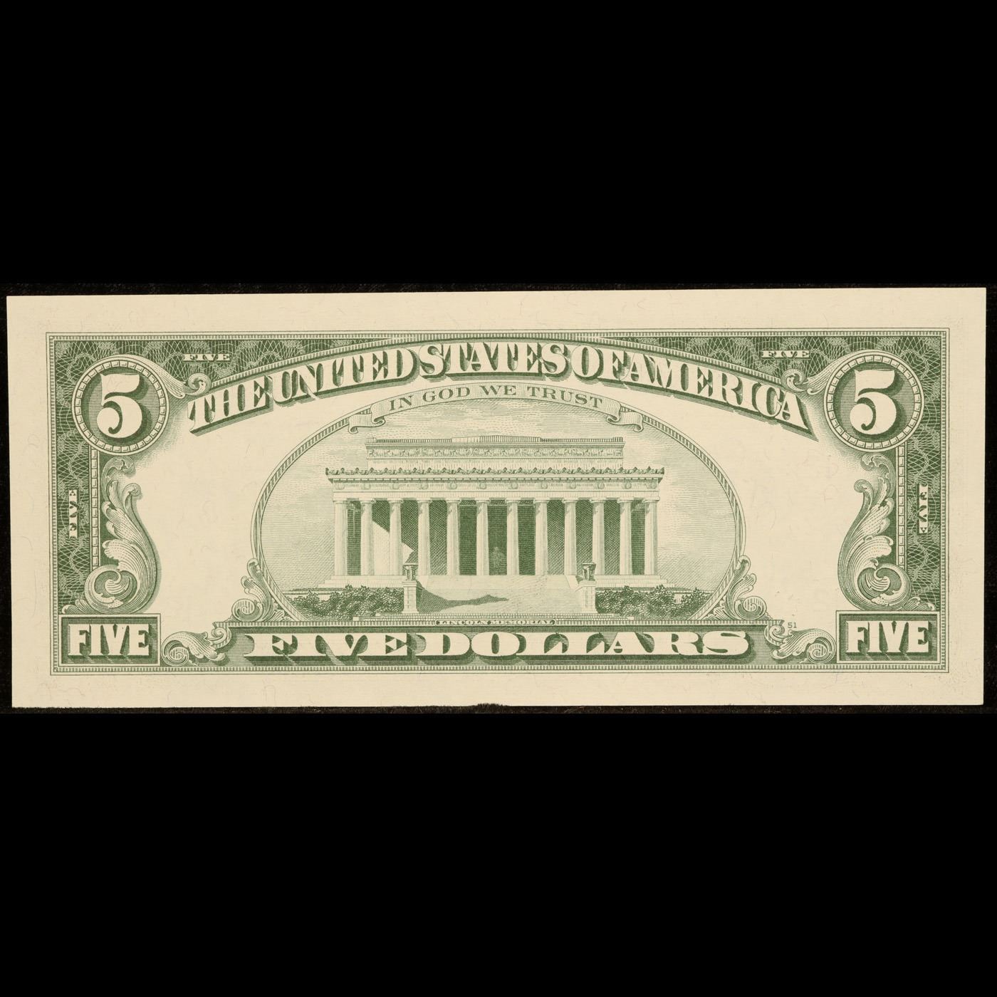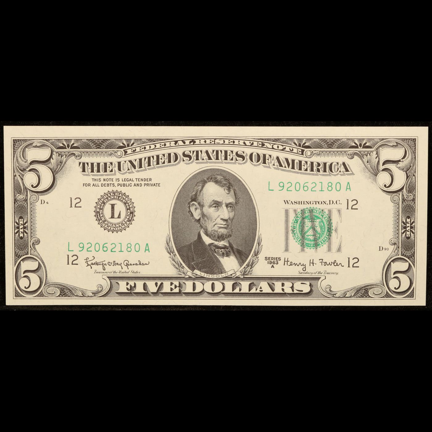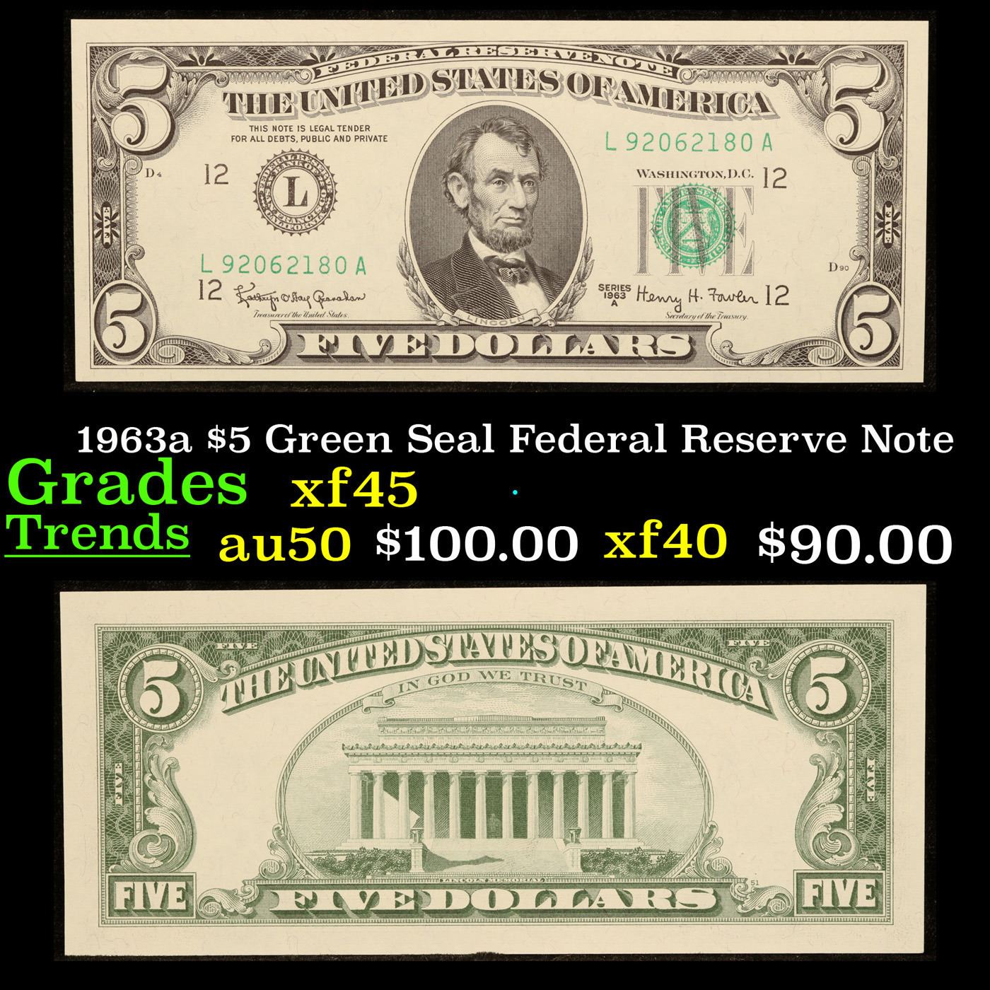 1963a $5 Green Seal Federal Reserve Note Grades xf+.