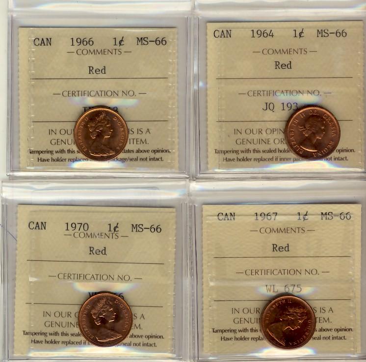 1964 1¢, 1966, 1967 & 1970 ICCS MS66RD. Lot of 4 coins.