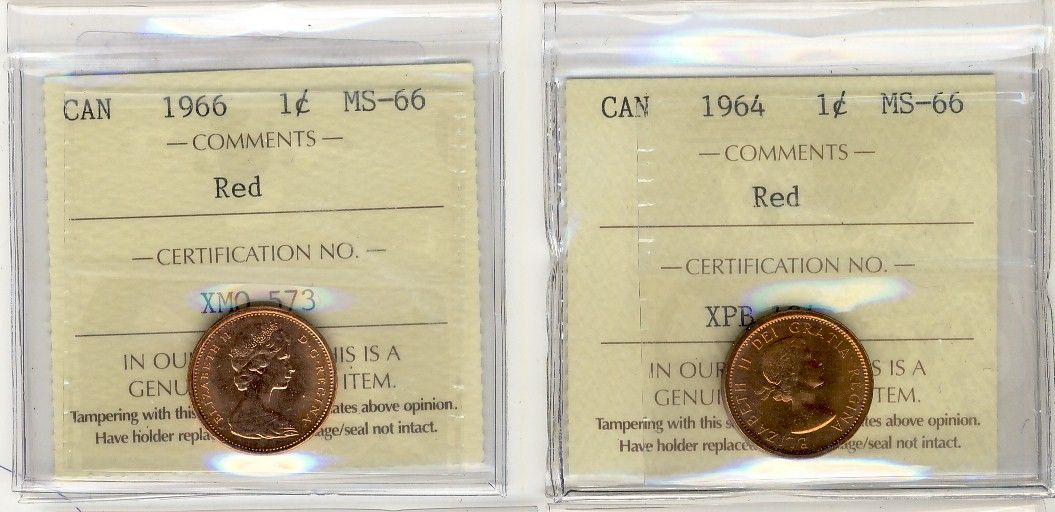 1964 1¢ & 1966 ICCS MS66RD. Lot of 2 coins.