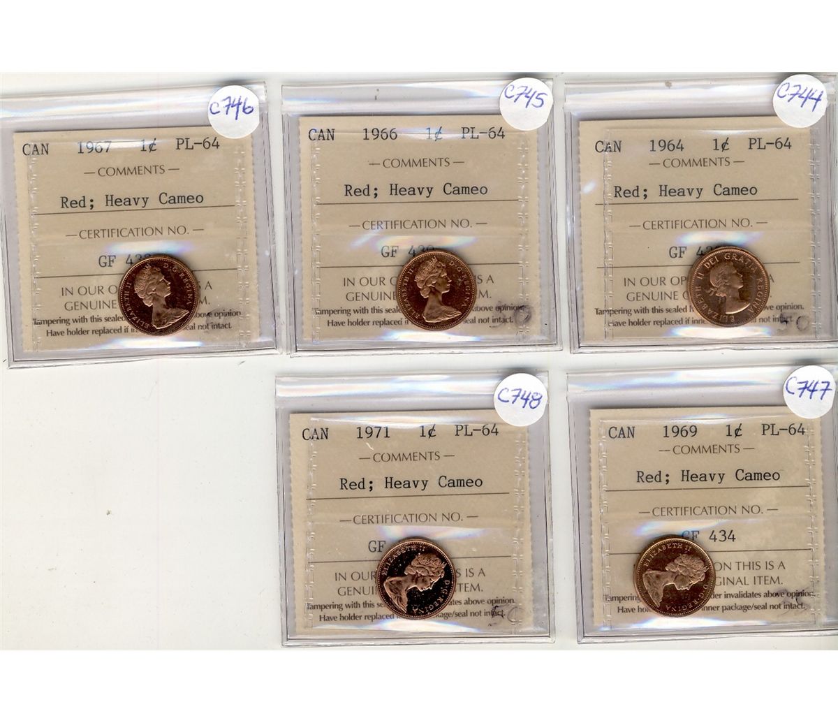 1964 1 Cent, 1966, 1967, 1969, 1971 ICCS PL64RD; Five coins.