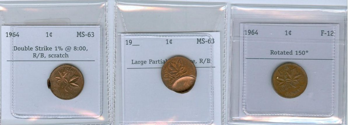 1964 1¢ ERROR coins. Lot of three error coins including 1964 with rotated die 150 degrees F12, 1964 1¢ with dbl strike/extra metal MS63RB and undated large partial brockerage MS63RB.
