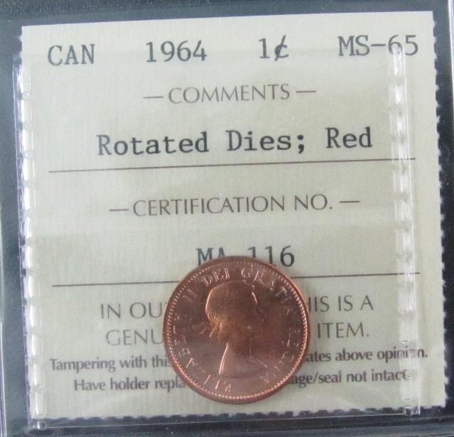 1964 1¢ ICCS MS65RD. Designated with Rotated die, approx 25%. Should be viewed.