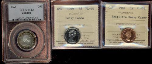 1964 1¢ ICCS PL64 UHC, Lot of 3 coins all certified Proof likes, includes 1969 5¢ ICCS PL65HC, 1960 25¢ PCGS PL65 and initial isted 1¢ 1964 UHC.