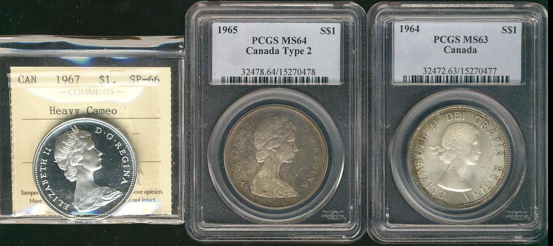 1964 $1 MS63, 1965 Type 2 MS64 & 1967 ICCS SP66 Heavy Cameo. Lot of 3 coins with first two being PCGS graded.