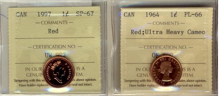 1964 1¢ PL66UHC & 1997 SP67. Lot of 2 ICCS graded coins.