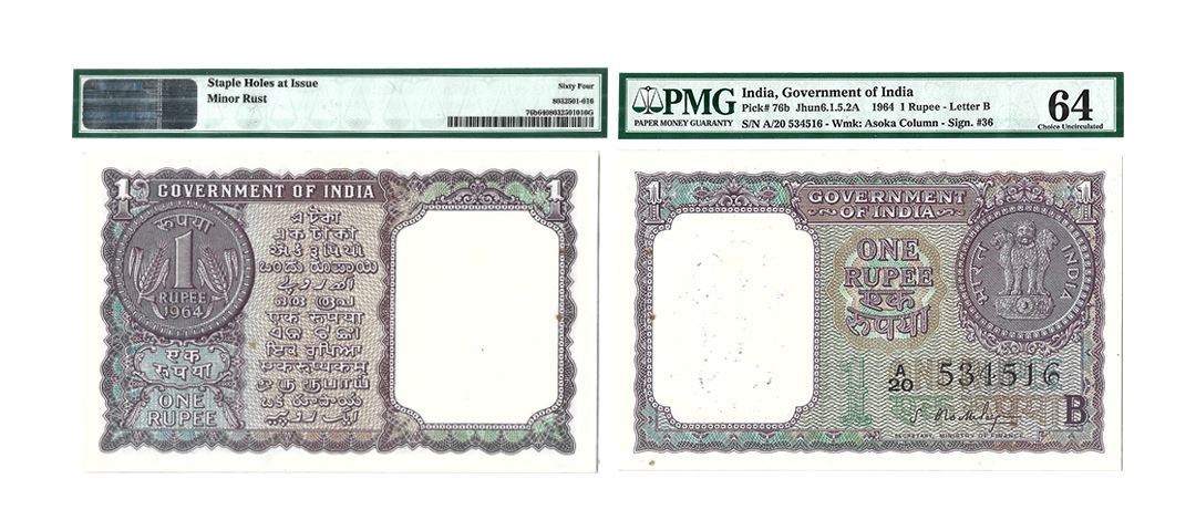 1964, 1 Rupee, Signed by S. Bhoothalingam, B Inset, A Prefix, S. No.A20 534516 , (KJ & RR # 6.1.5.2 A), staple holes at issue, rust, graded by PMG as 64 Choice Uncirculated, Very Rare.