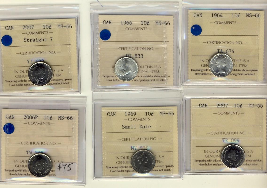 1964 10¢, 1966, 1969 Sml, 2006P, 2007 & 2007 St7 ICCS MS66. Lot of 6 coins.