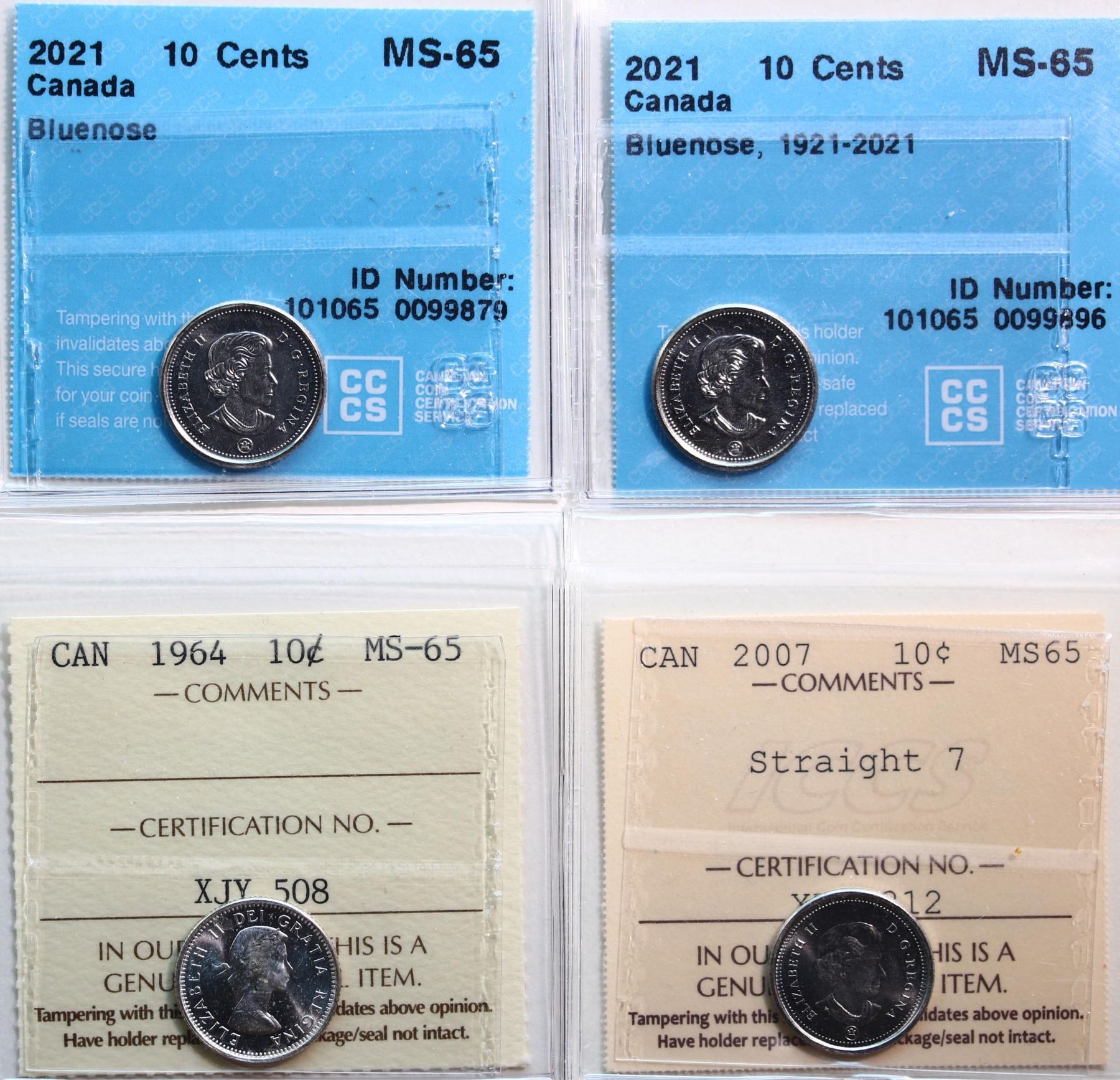 1964 10¢, 2007 "Straight 7", 2021 "Bluenose, 2021 "Bluenose 1921-2021" All 4 coins ICCS Gem Mint State-65.